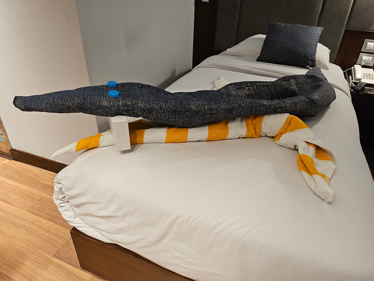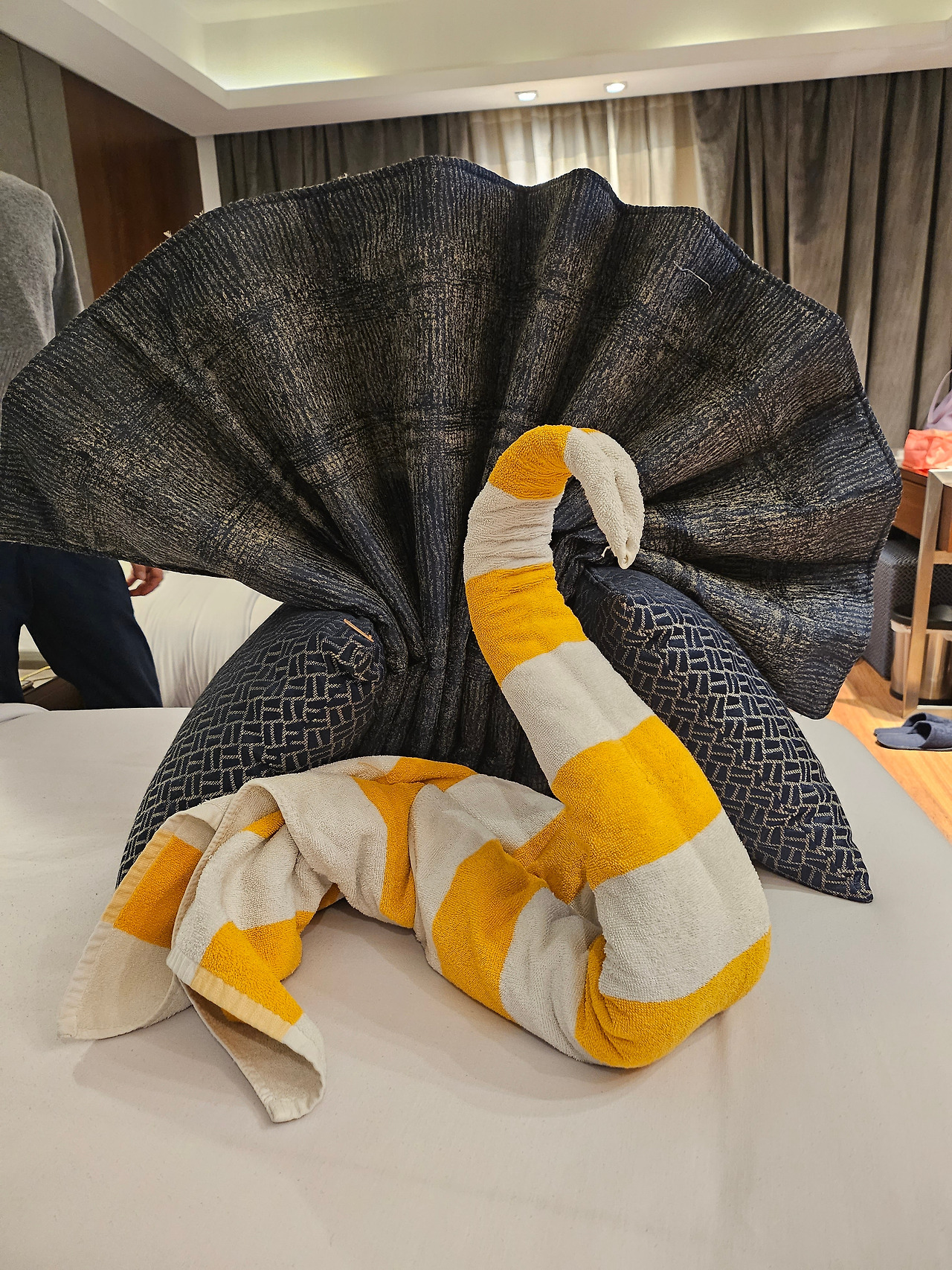 아침 일찍 크루즈는 나일 강 하류로 항해를 시작했다. 창문으로 옆을 지나는 다른 크루즈가 훤히 가까이 보인다. 이 크루즈에는 유럽 관광객들만 승선해 있었는데 차가운 바람에도 아랑곳없이 수영과 선탠을 즐기는 사람들이 있었다. 배에서 내려 관광을 하고 돌아오니 2달러 팁에 대한 감사의 의미로 배의 직원이 침대 시트로 귀여운 동물을 만들어 놓곤 했다. 1달러를 둔 날은 아무것도 없었는데 2달러 팁의 힘인가 보다. 시트만으로 어찌 이리 멋진 작품을 만들었는지 신기했다.