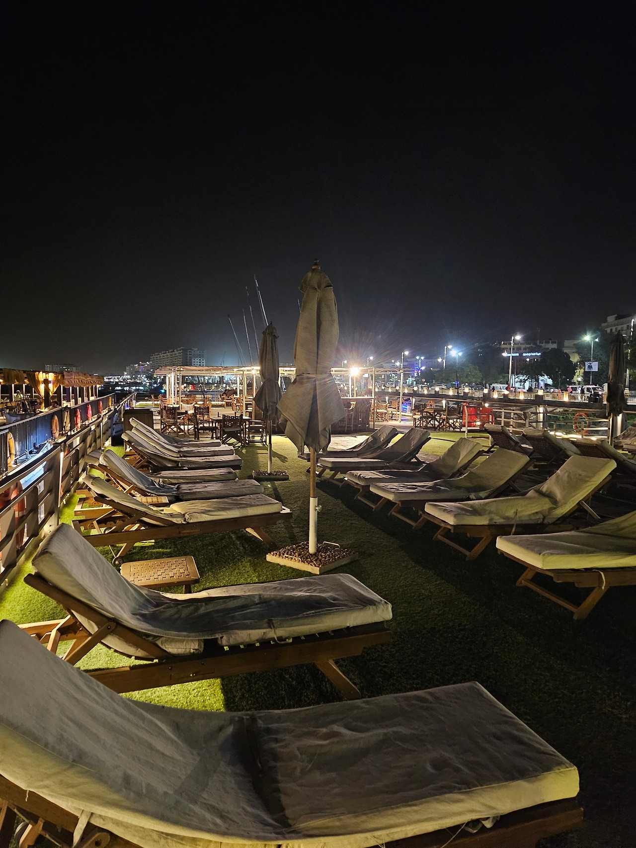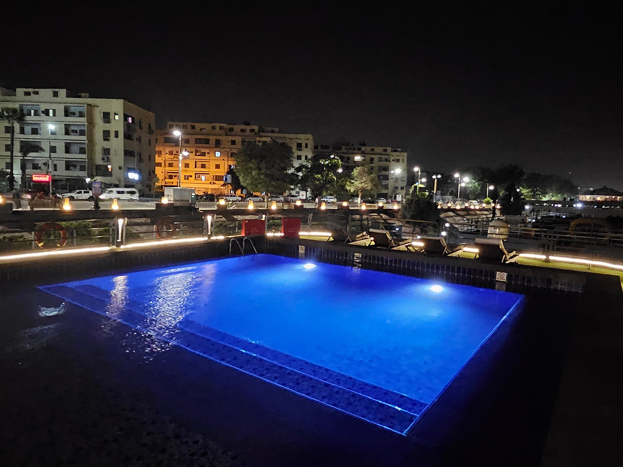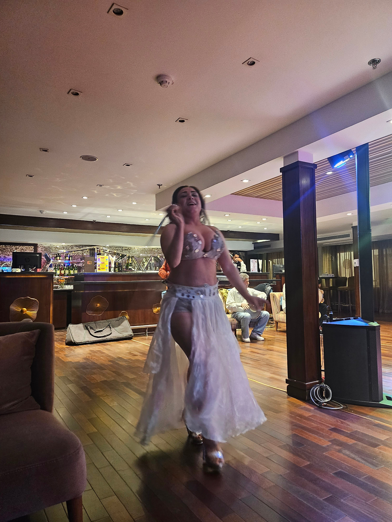 저녁에 아부심벨 항구에 도착하자 관광객들은 저마다 예약한 배를 찾아 승선했다. 지하 1층을 포함하여 총 4개 층의 크루즈였다. 선상을 둘러보니 수영장과 선베드, 파라솔과 Bar가 있었지만 차가운 밤바람을 맞으며 수영을 하는 용감한 승객은 없었다. 첫날 저녁에 식사 후 9시부터 웰컴 이벤트가 있다고 안내를 받았다. 식사 후 잠시 누워있다가 음악소리에 홀(Hall)로 갔더니 벨리댄스를 추는 여성이 있었다. 20년 전에 봤던 댄서에 비해 무척 건강한 모습에 웃음이 났다. 흥겨운 음악과 댄스를 잠시 구경하다 나와 선상으로 올라갔다. 밤의 불빛 아래에서 바라본 해변과 파라솔이 운치가 있었다.