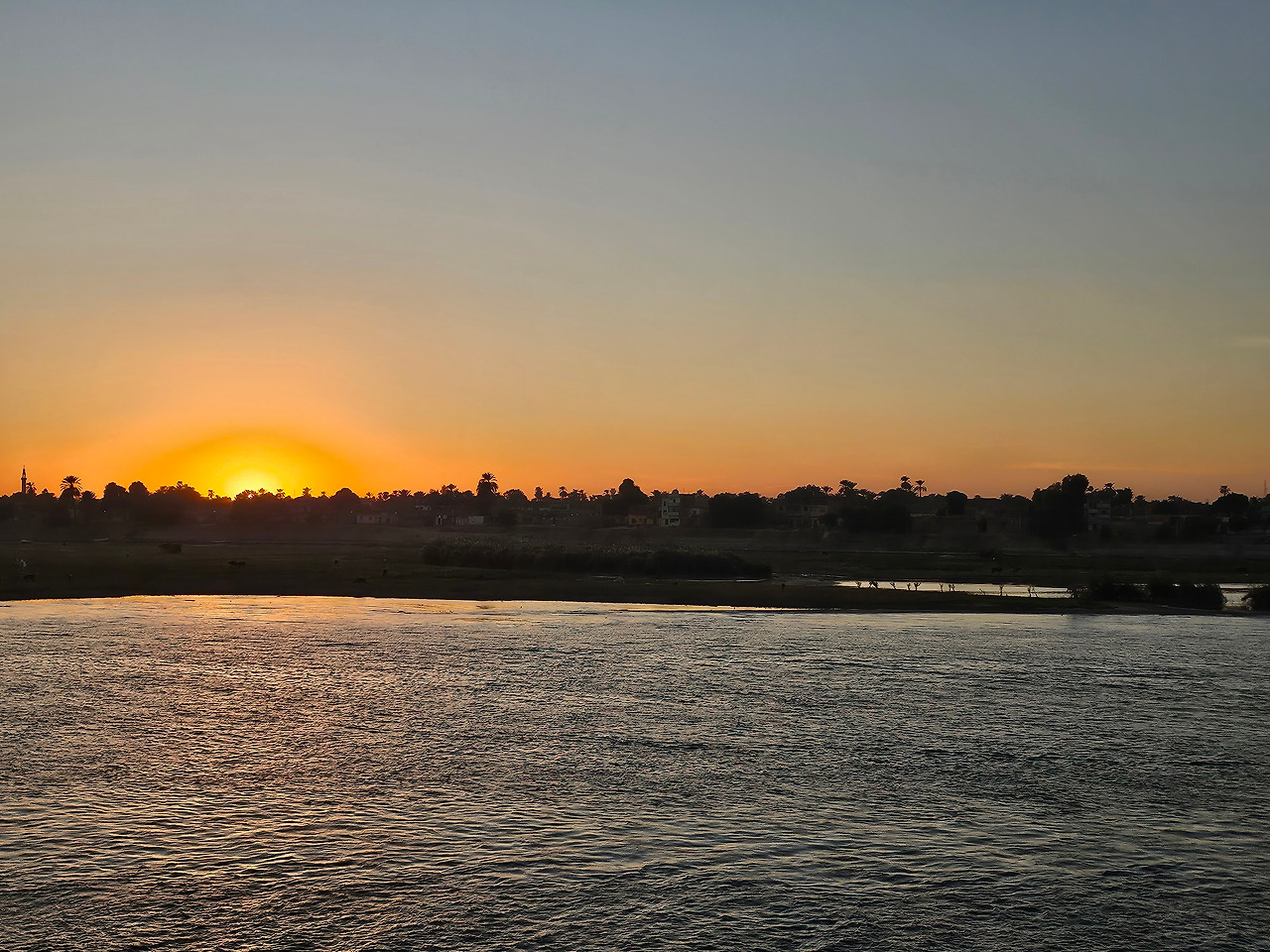 배에서 보니 산 너머로 태양이 내려가고 있다. 붉게 물든 하늘과 나일 강.