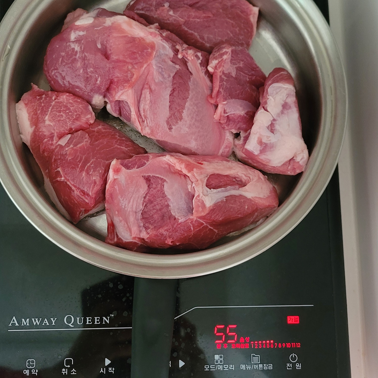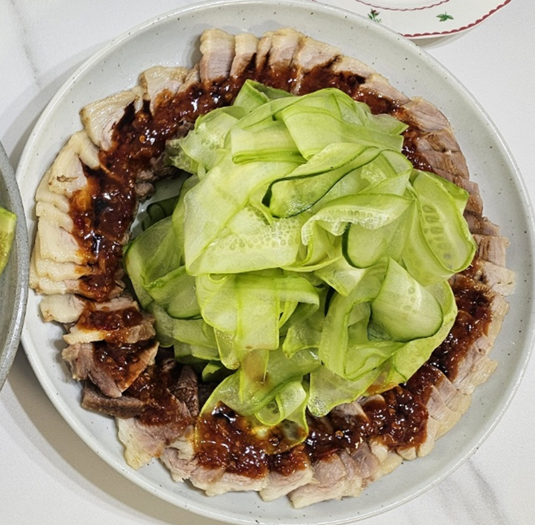 (재료) 보쌈용 돼지고기 통삼겹 600g, 오이 2개, 감자칼