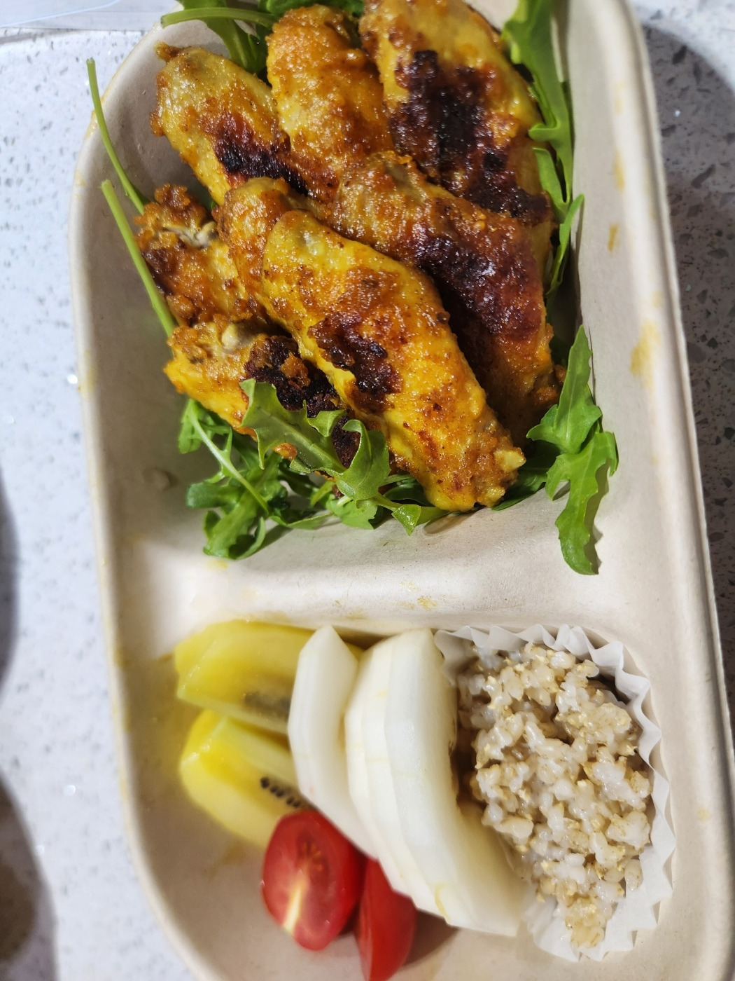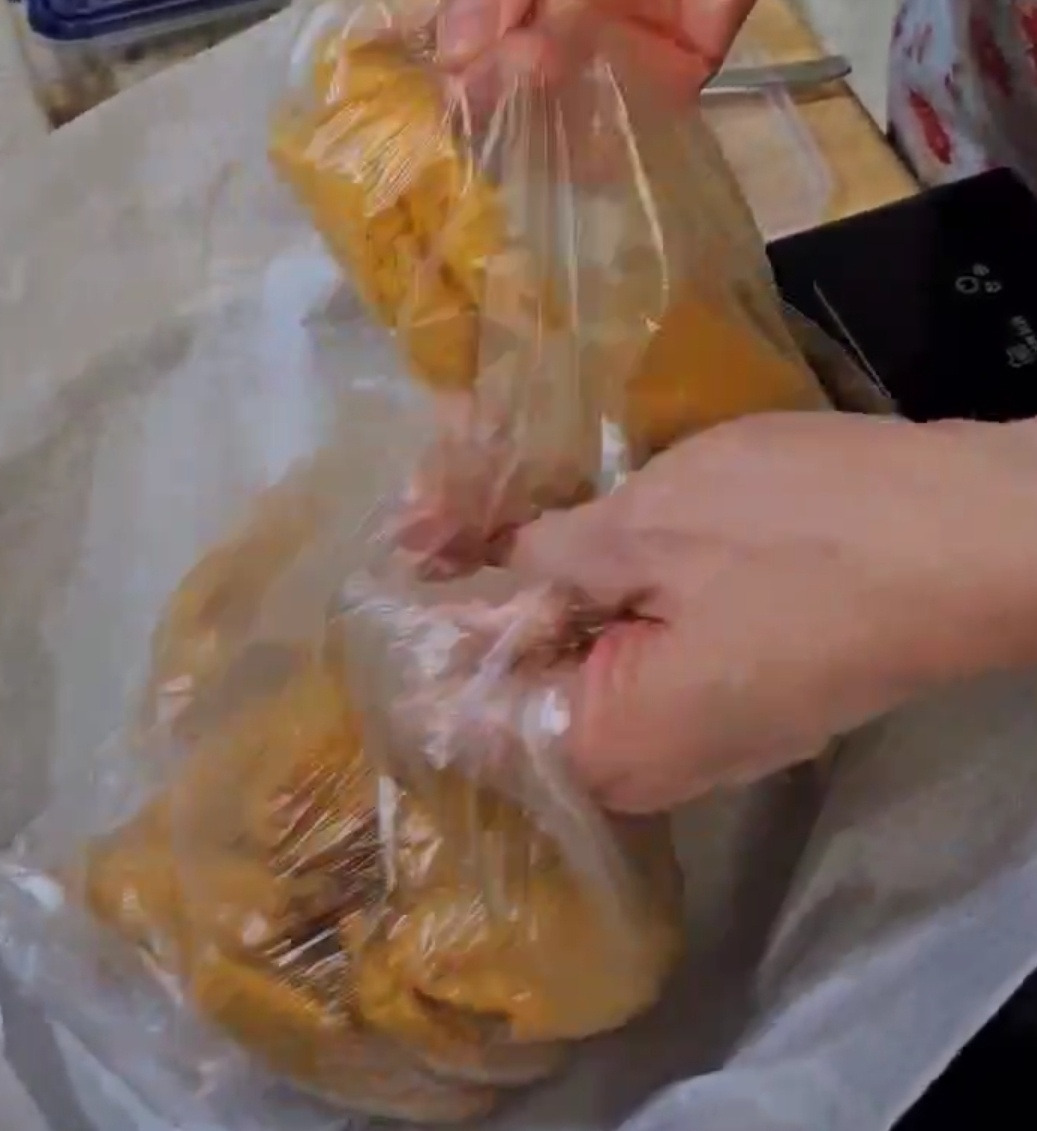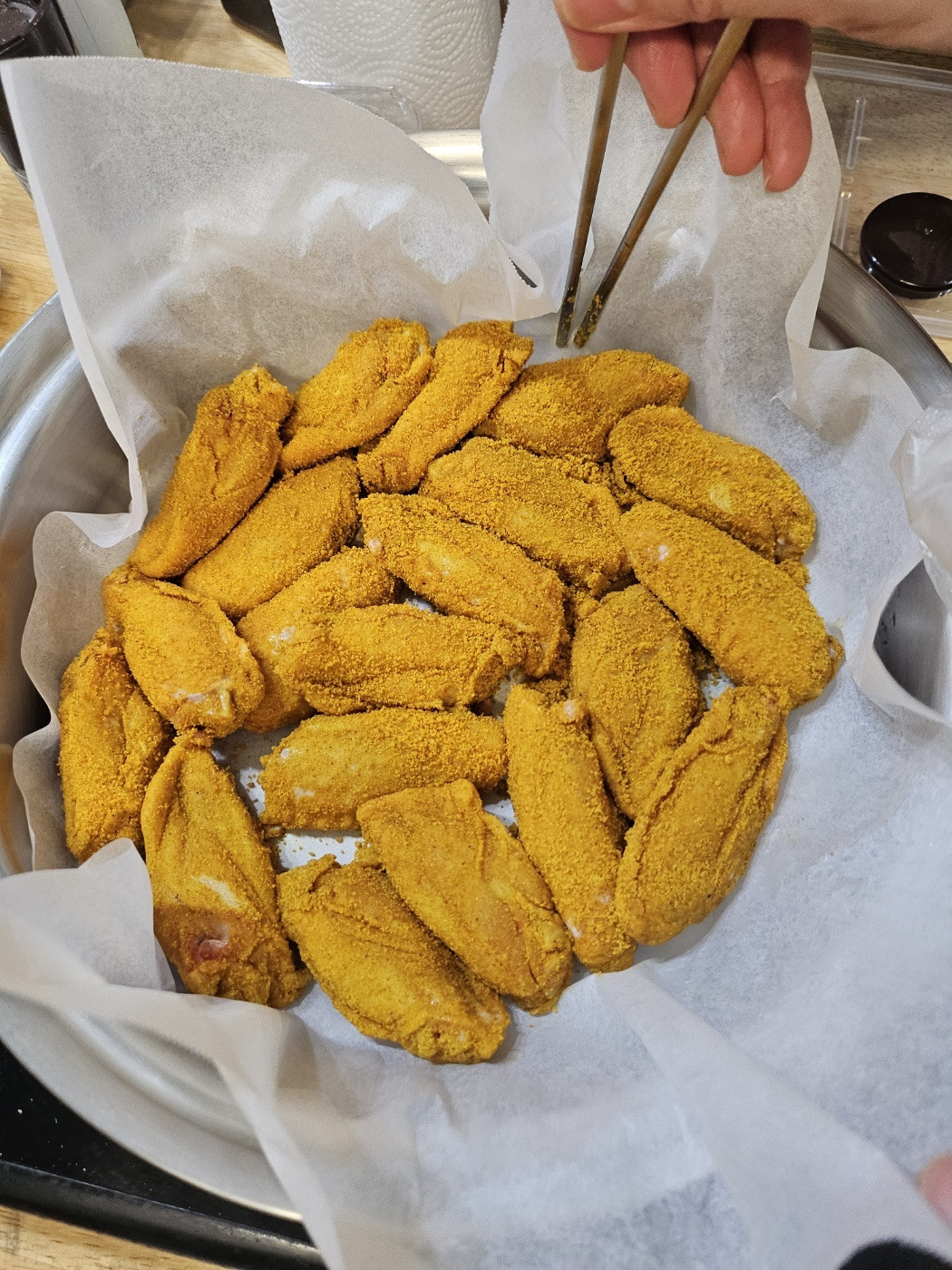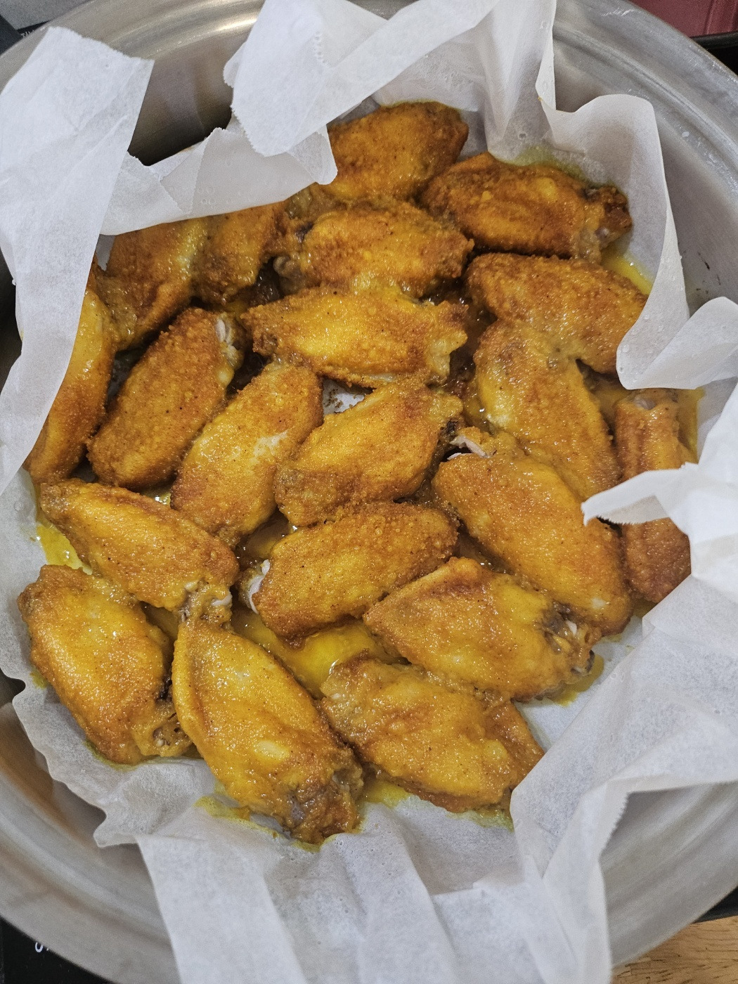 퀸 Ti 프라이팬이 다양한 요리를 뚝딱 해내는 것을 보면 '역시 장비발!!!' 이다. 새로 구입한 전동 거품기는 머랭을 순식간에 만들고, 며느리집에서 가져온 큰 믹서기는 단호박을 눈 깜짝할 사이에 갈아서 조리시간을 반으로 줄여주었다. 두 손과 주걱만으론 30분간의 가사노동을 피할 수 없었던 조리시간이 10분도 안되게 단축된 건 역시나 장비발이다. 여기에 빠질 수 없는 장비(?)가 바로 비닐봉지이다. 비닐봉지에 카레 가루를 넣고 물기를 닦아낸 치킨 윙을 넣고 아래위로 가볍게 흔들어 구우면 초간단 카레 윙 구이가 완성되고, 전분가루에 치킨 봉을 넣고 흔들어 튀기면엄마표 교촌치킨이 된다. 튀긴 치킨에 익숙해져 있던 우리 모녀를 새로운 맛의 세계로 안내한 것이 있었으니 바로 카레 윙 구이이다.