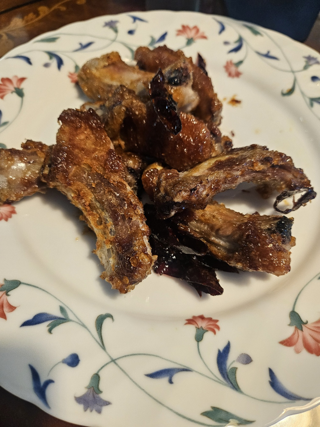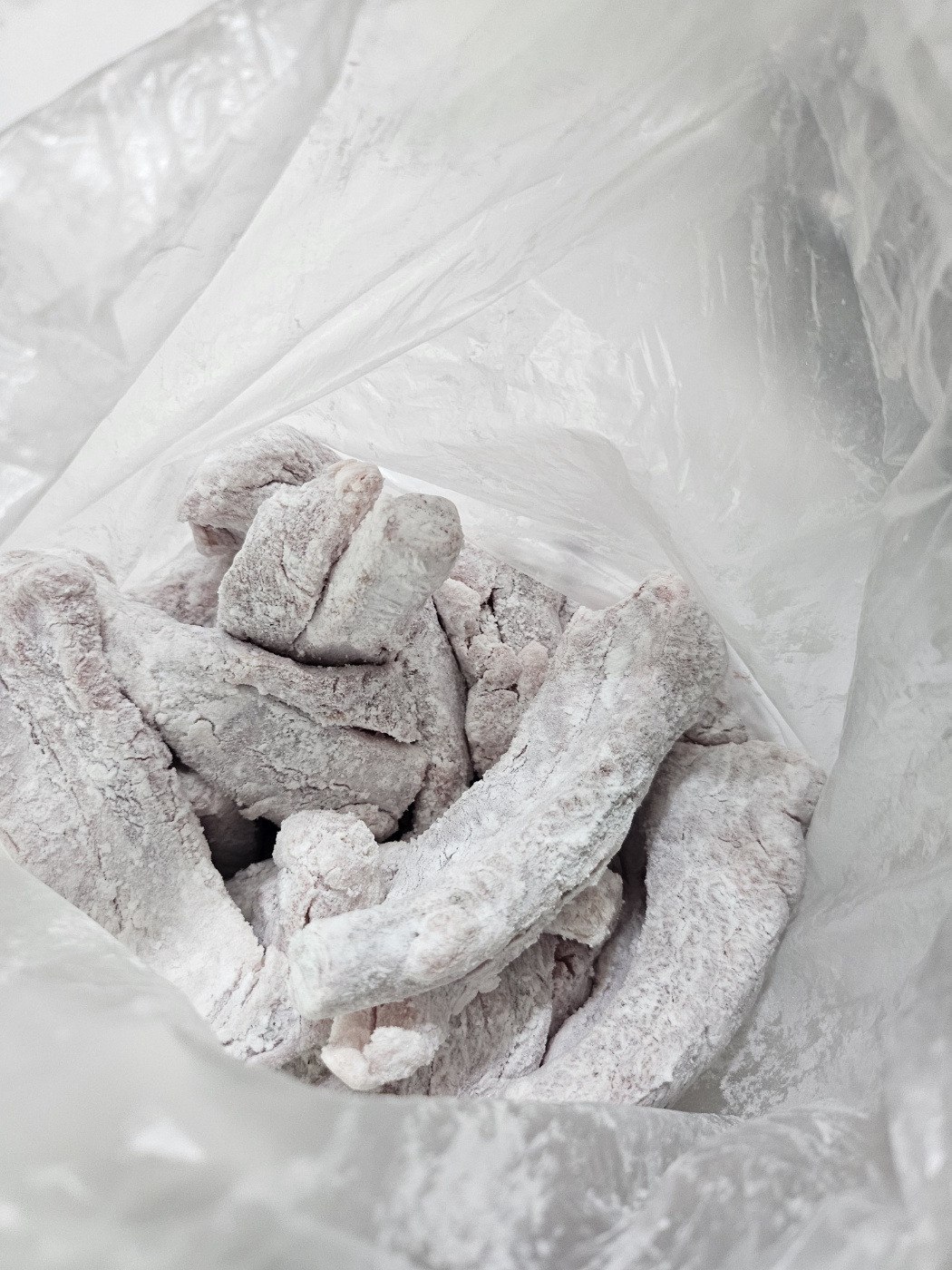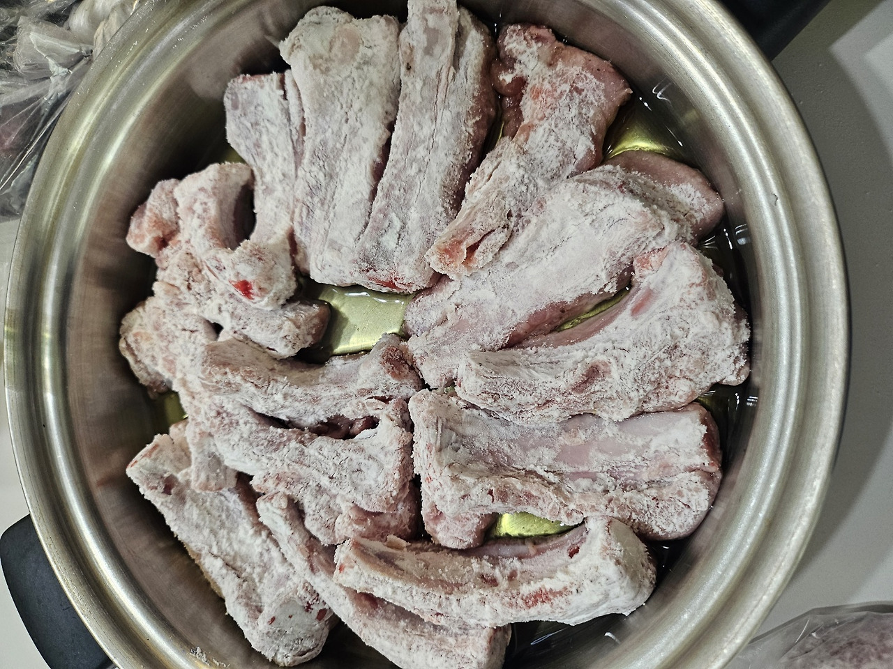 1) 등갈비 핏물 빼고 물기 제거한다. 비닐봉지에 감자전분과 등갈비를 넣고 흔들어 고루 묻힌다 shake, shake! 퀸 프라이팬에 등갈비가 1/3 정도 잠길만큼만 포도씨유를 붓고 등갈비를 세로로 배열한다. 센 불로 맞춘 후 뚜껑을 덮는다. 지글지글 튀겨지는 소리가 나지 않을 때까지 두었다가 소리가 잦아들면 뚜껑을 열고 등갈비를 뒤집어 준다. 뚜껑의 수분을 치킨타월로 닦아낸 후 다시 닫아둔다