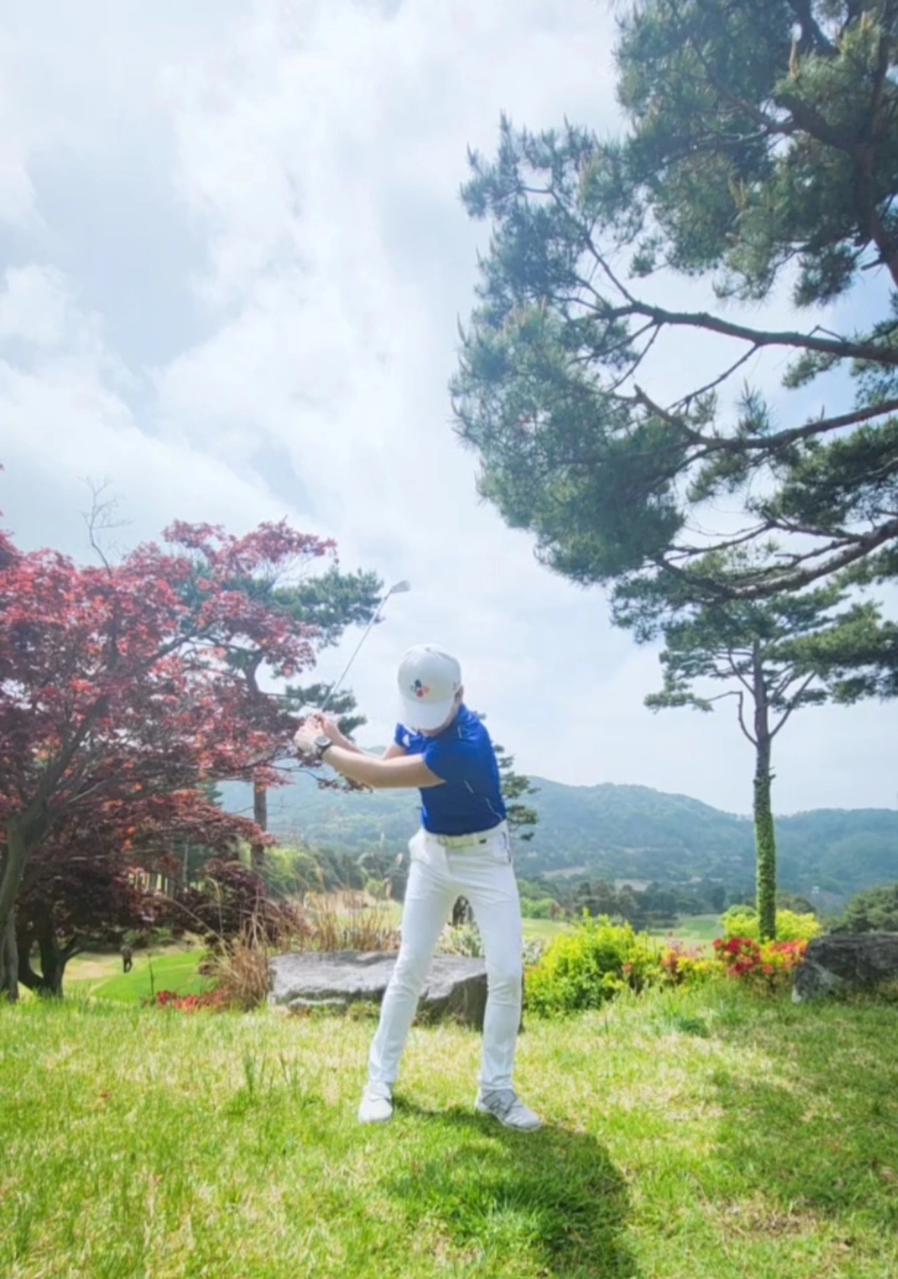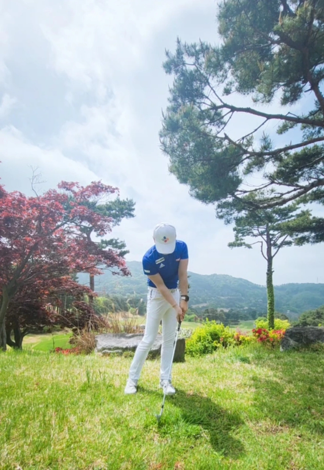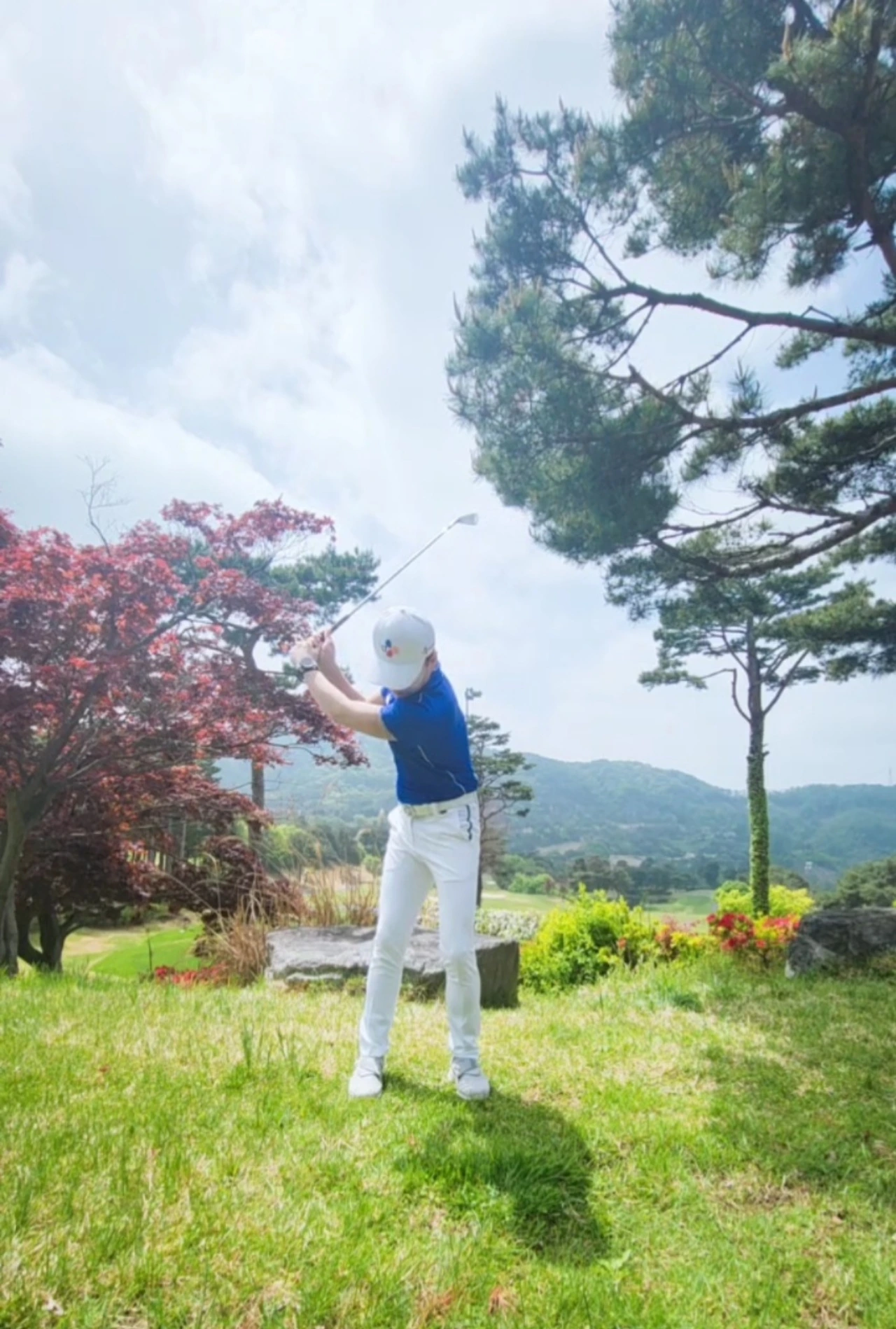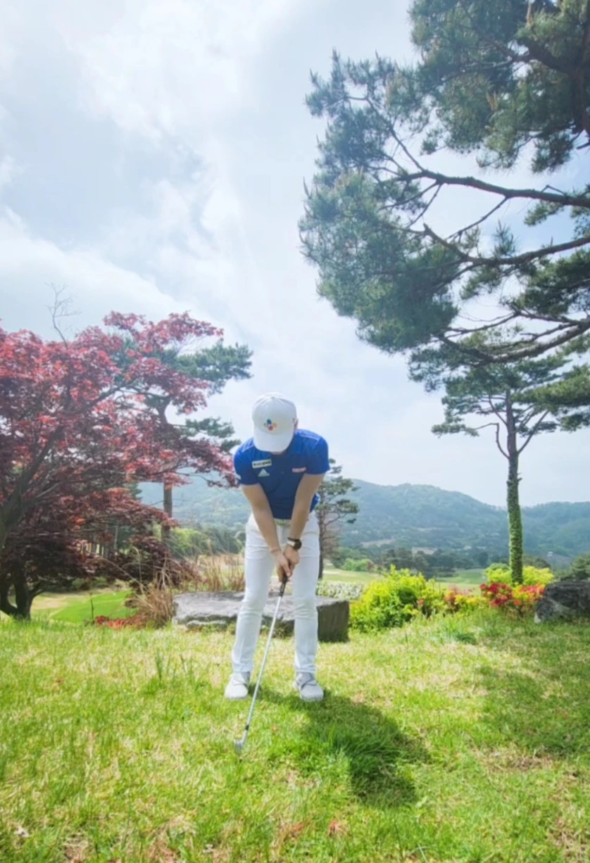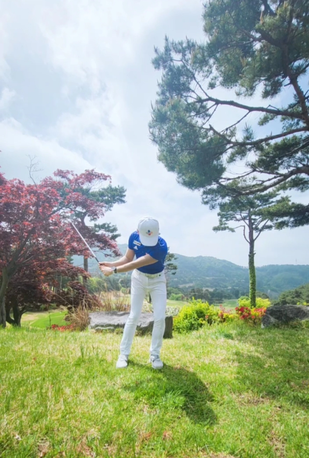 1)양발을 모으고 셋업하고, 백스윙 탑에 갔다가