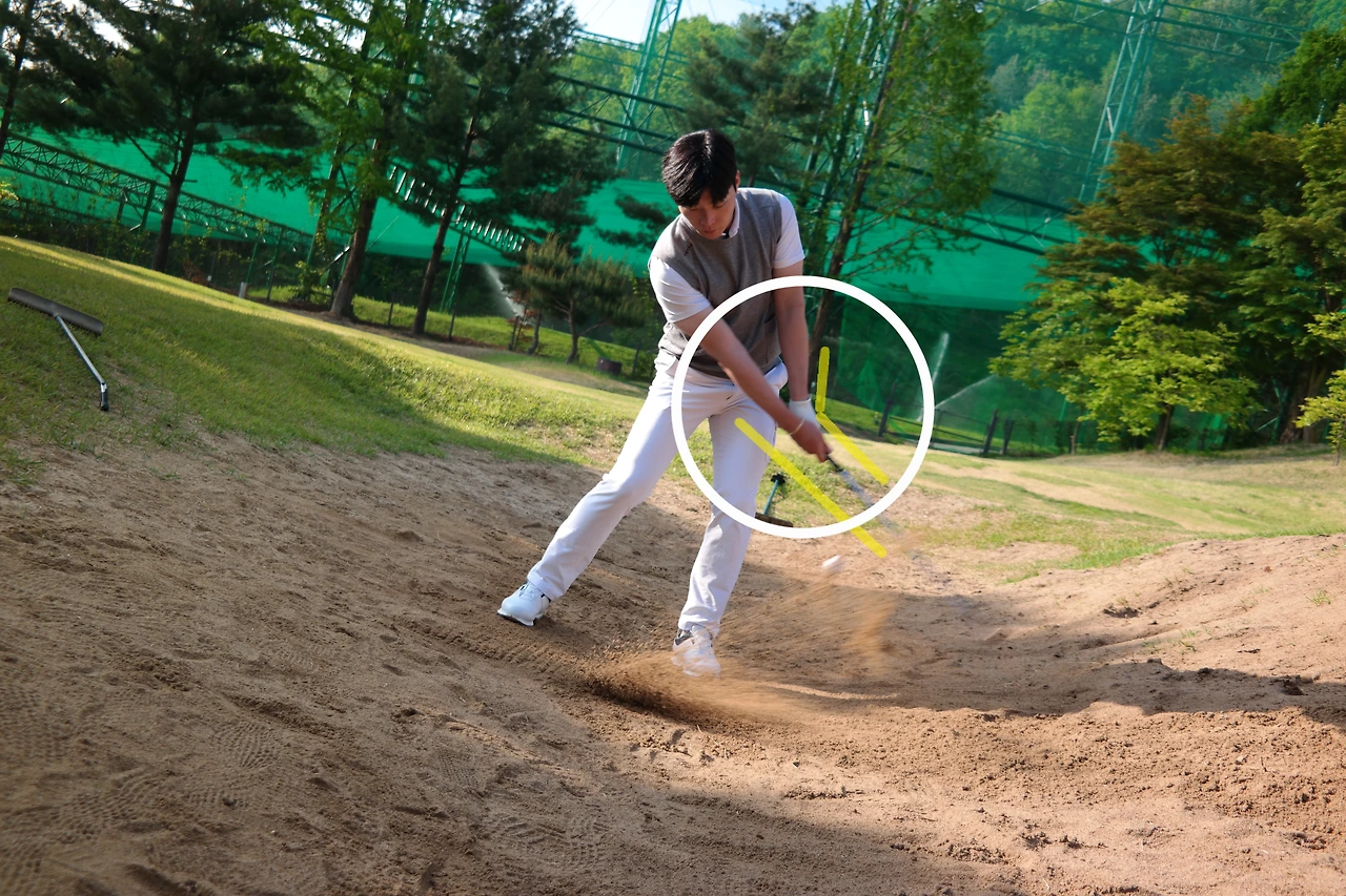 그린주변 벙커샷은 임팩트 전후에서 왼손이 돌아가지 않도록 의도적인 오른손을 아래에 두는 언더릴리즈가 필요하며, 왼손등이 위로 꺽여도 좋다.