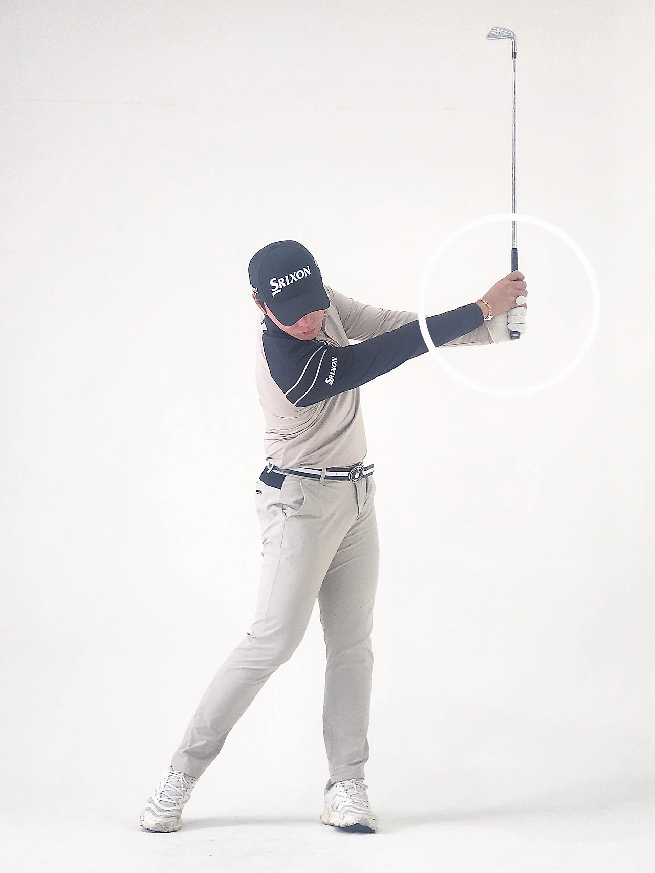 사진처럼 그립을 분리해서 잡고, 백스윙 탑에 갔다가, 사진 구간(P6)까지 내려와서 멈추는 연습을 자주 해주는 것이 좋다(KPGA 이종수 투어프로)