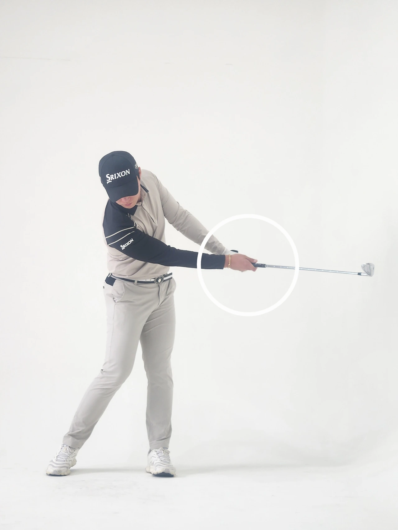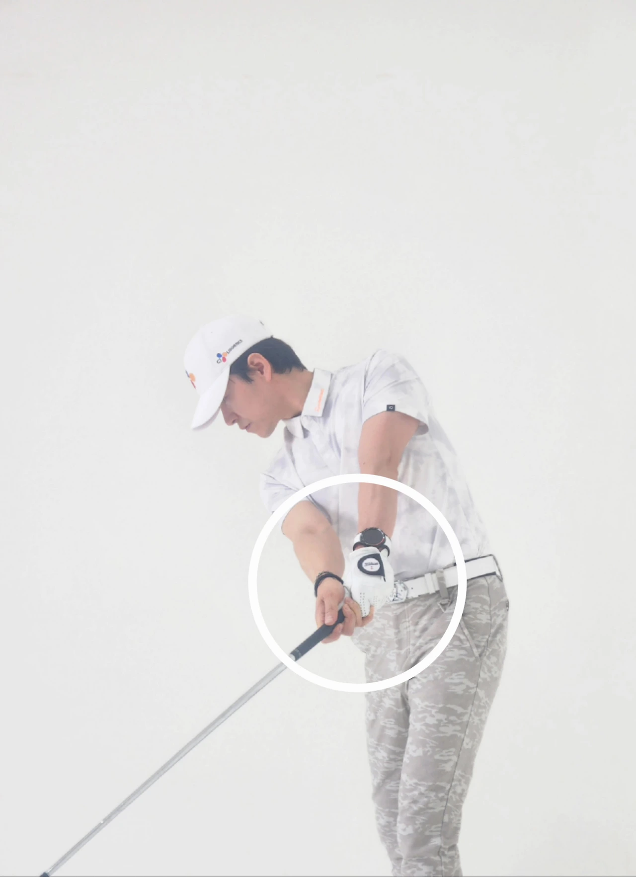 2. 슬라이스가 많이 나는 골퍼는 언더릴리즈보다는 오버릴리즈와 함께 손을 적극적으로 쓰는 핸즈릴리즈가 유용하다. 다만, 개인적으로권장하는 방법은 릴리즈의 주동을 오른손보다는 왼손으로! 나아가 왼손보다는 왼팔꿈치 주변의 팔뚝을 다운스윙 초기부터 로테이션하겠다는 의도를 갖는 것이다.