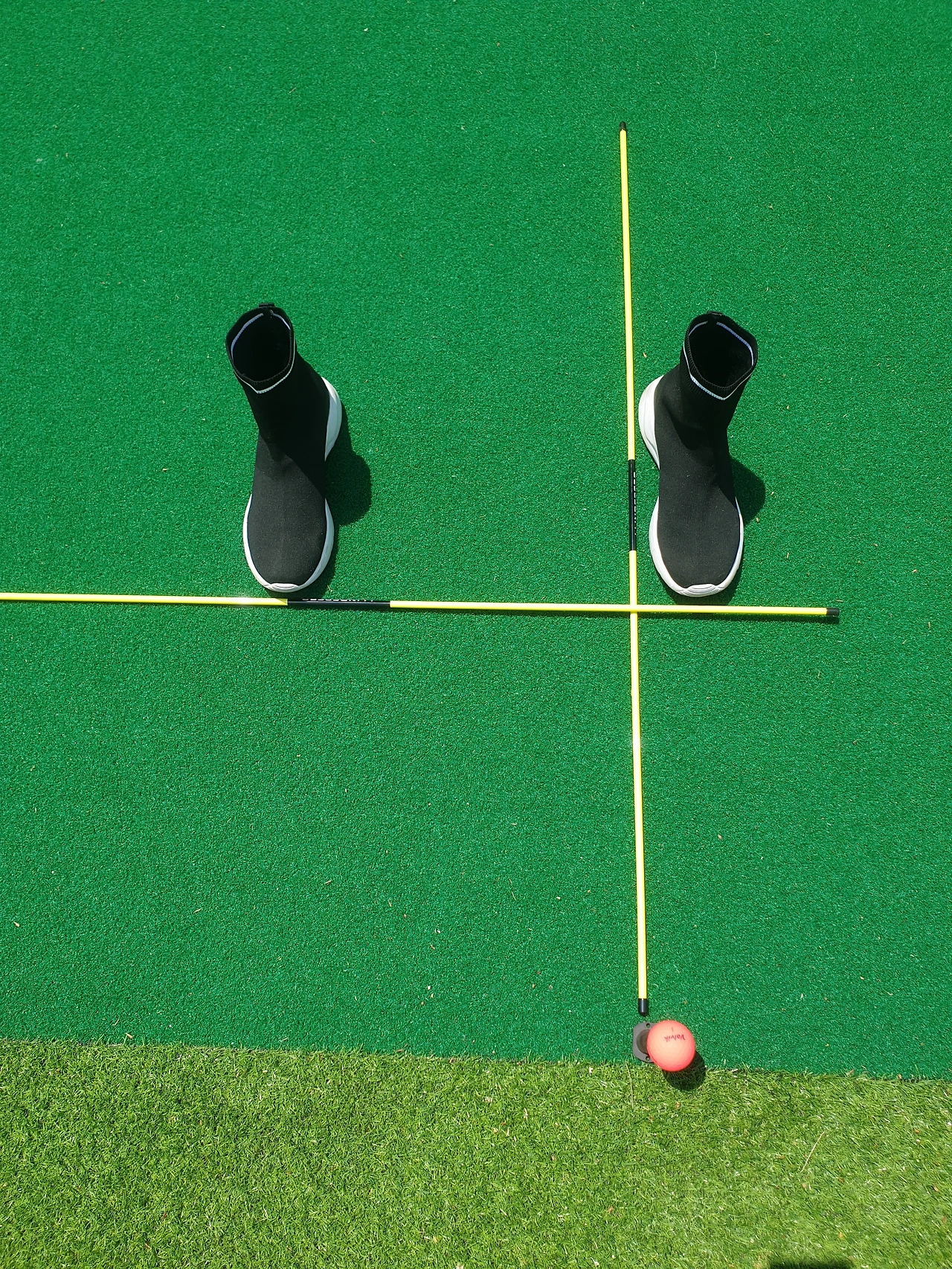 볼의 위치는 아웃인 스윙패스를 잘 만들 수 있도록 하는 것이 중요한데, 평소보다 볼을 더 타깃 쪽에 두어야 아웃인 스윙패스를 만들기 쉬운 거야.
