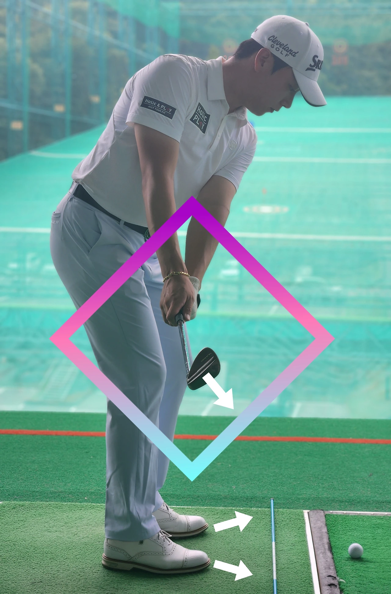 '1.stance'에서 알려줬듯이, 오픈스탠스를 취하는 골퍼는 먼저 스퀘어스탠스를 취한 후, 오픈 스탠스로 변경하는 것을 루틴으로 장착해야 셋업의 오차를 줄일 수 있어.