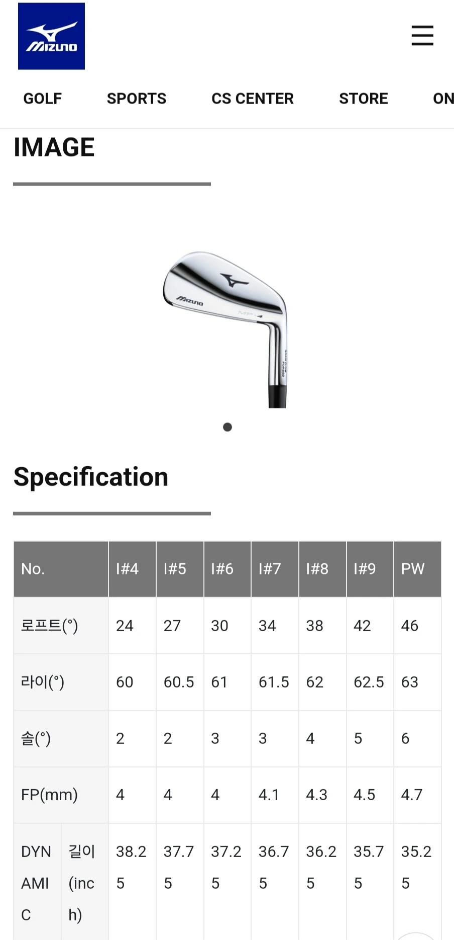 필자의 미즈노 MP4 클럽스펙을 보면 클럽의 길이와 로프트가 변하는 것을 알 수 있고, 롱아이언으로 갈수록 클럽헤드의 무게가 가벼워진다.