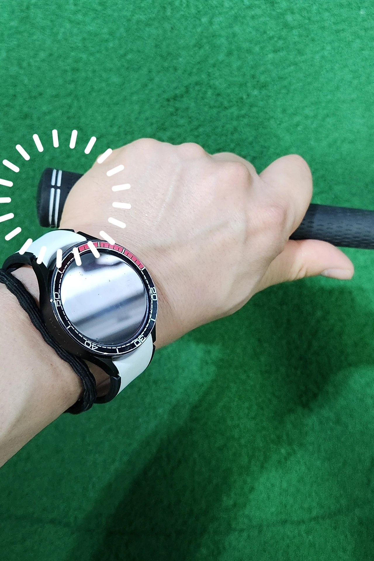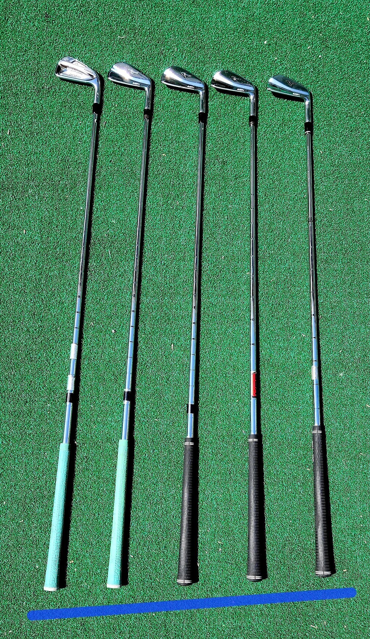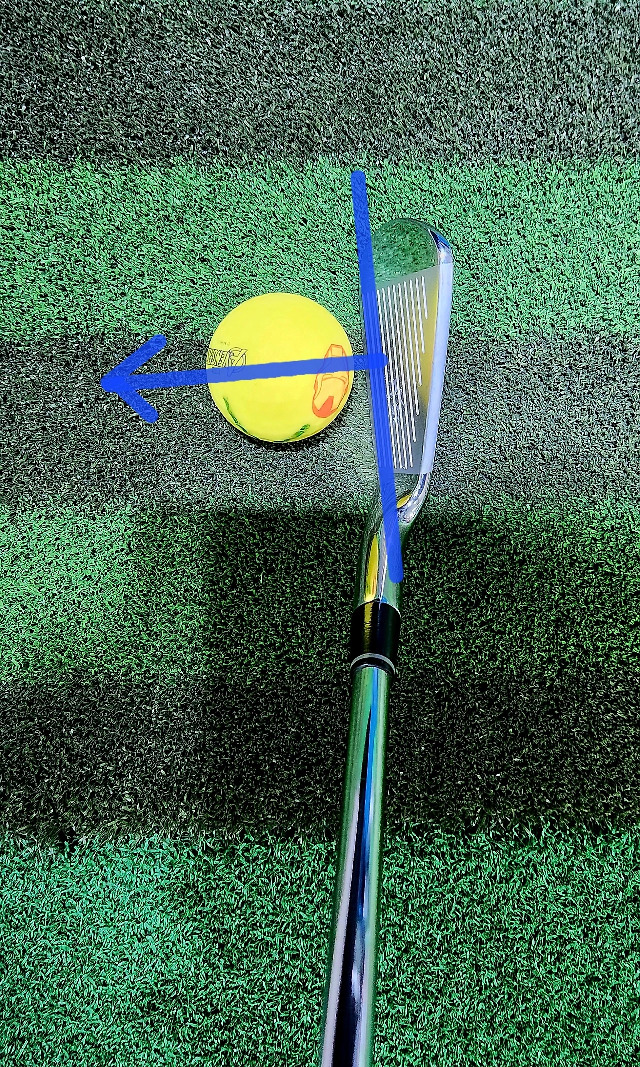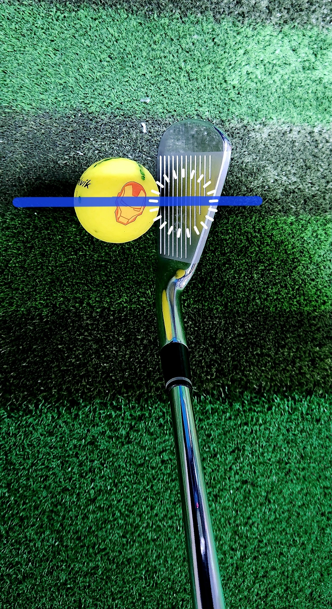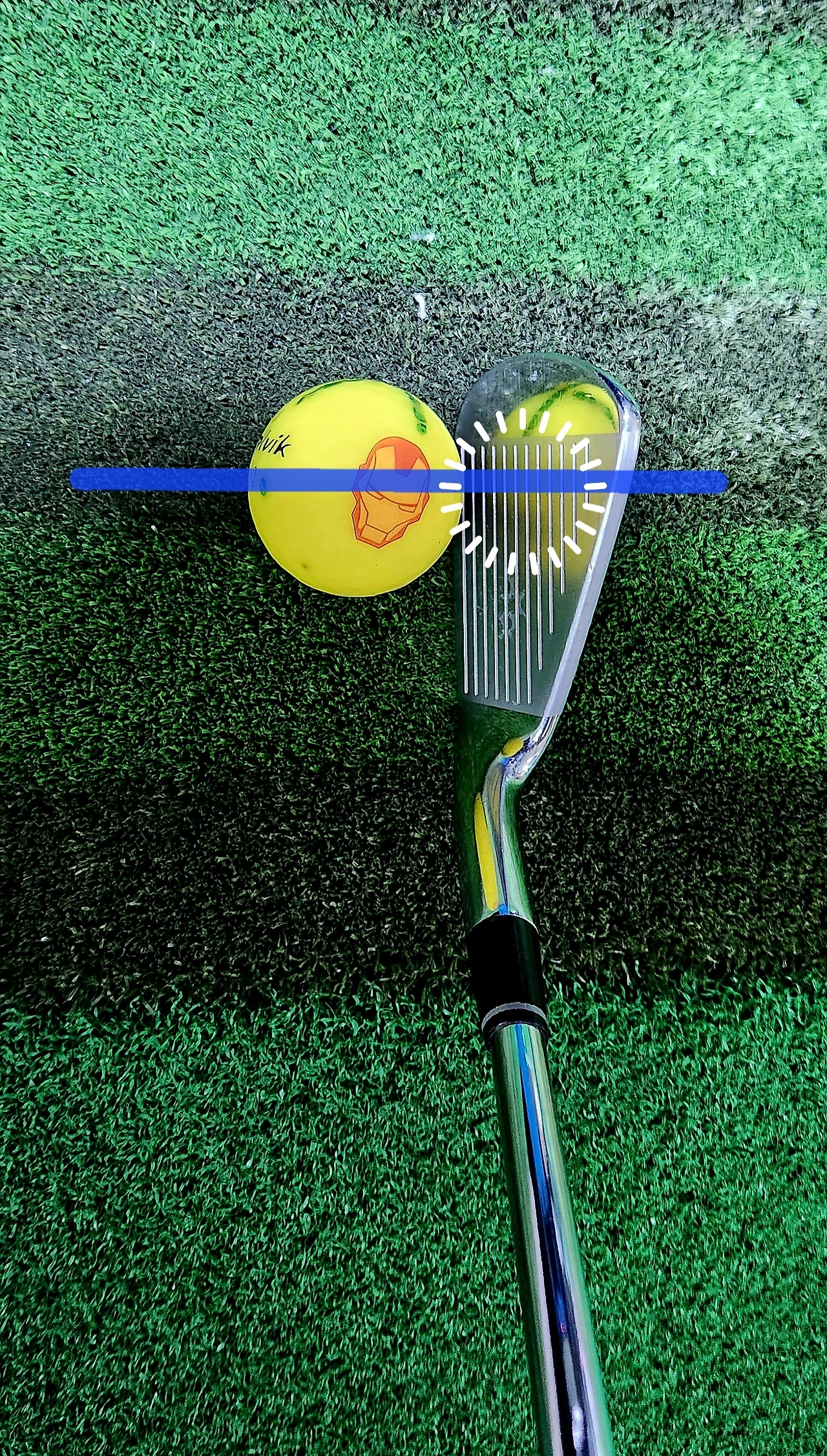 롱아이언은 우측의 사진처럼 짧게 내려 잡으면 볼이 지면에 찍혀 맞아서 발생하는 비거리 손해를 막을 수 있다.