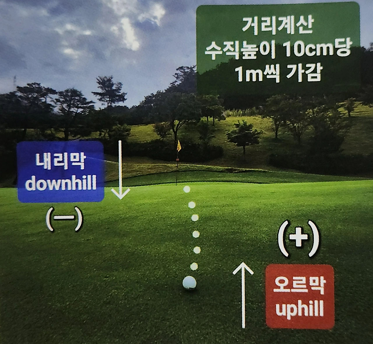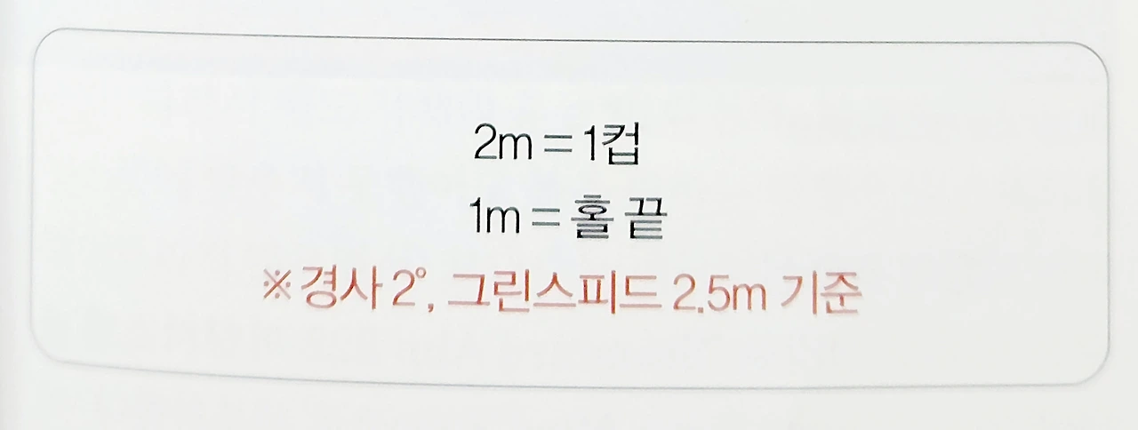 -막연한 오르막, 내리막이 아닌 그린스피드(2.5) 기준으로 오르막과 내리막의 경사를 거리로 환산하는 가장 정밀한 측정기준과 방법이며, 그린스피드와 그 외 변수에 따라 가감을 체계화함.