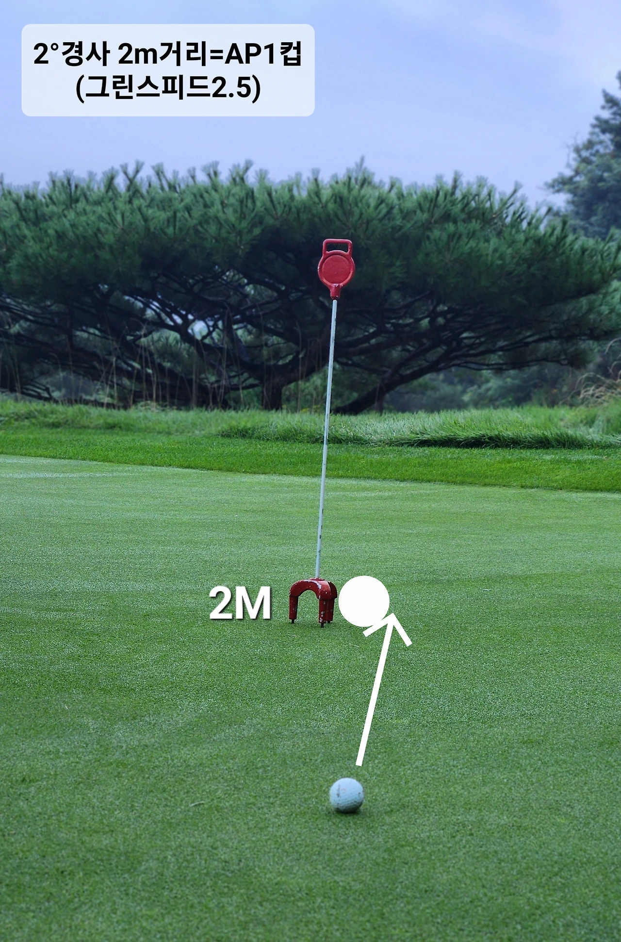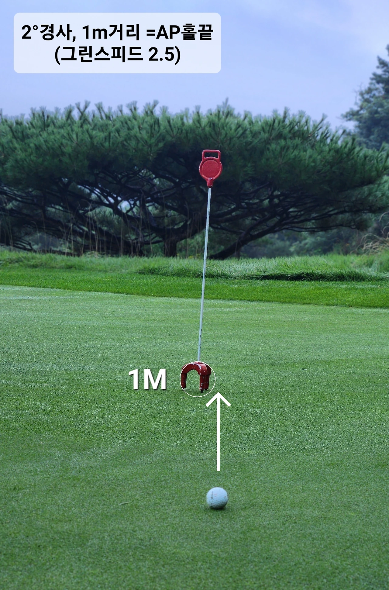 위 기준에 퍼팅스트로크 스피드를 맞춰 표준화되면, 자동은 같은 경사에서 2m는 1컵, 1m는 홀의 양끝이 AP가 되는 거야.