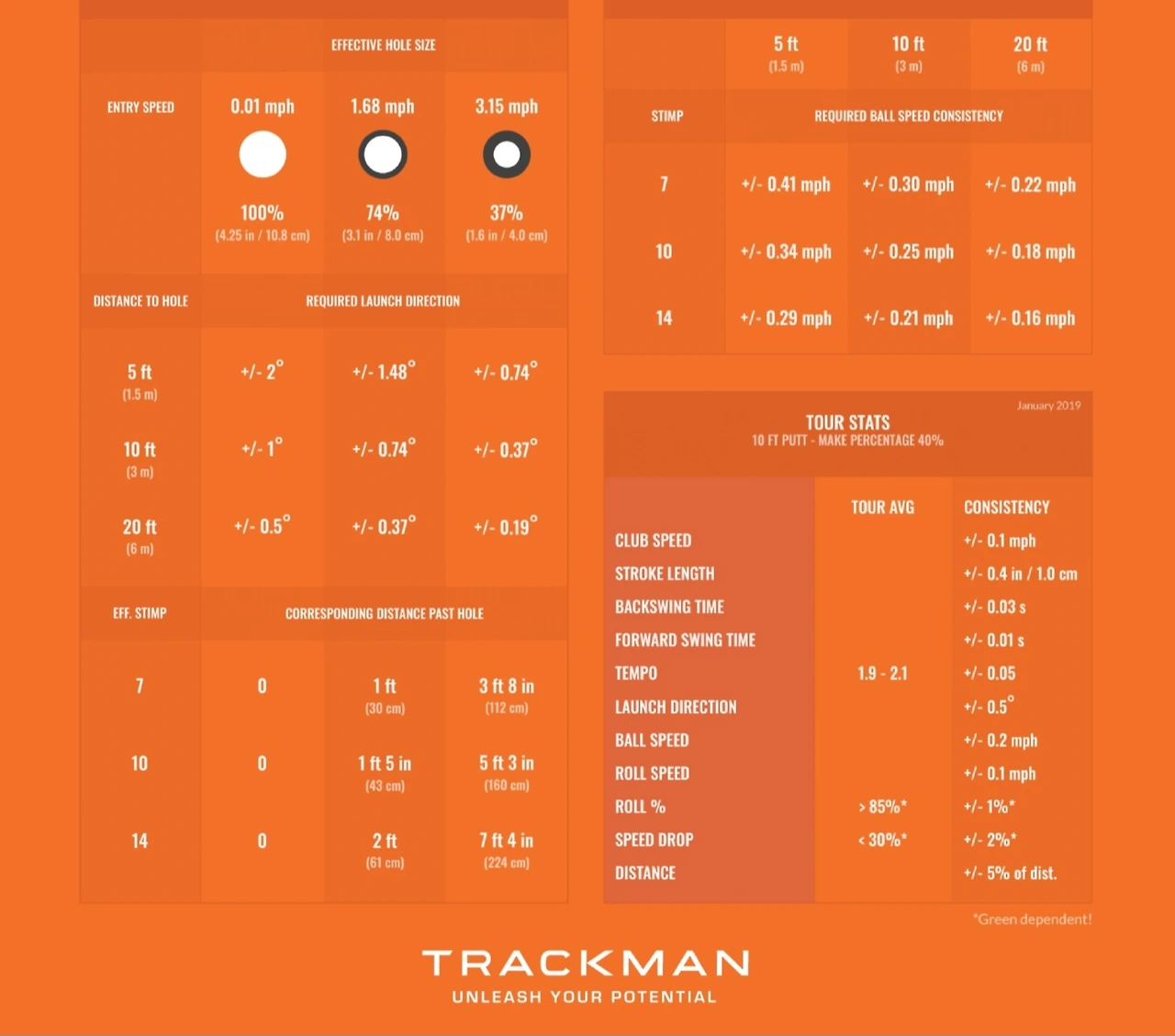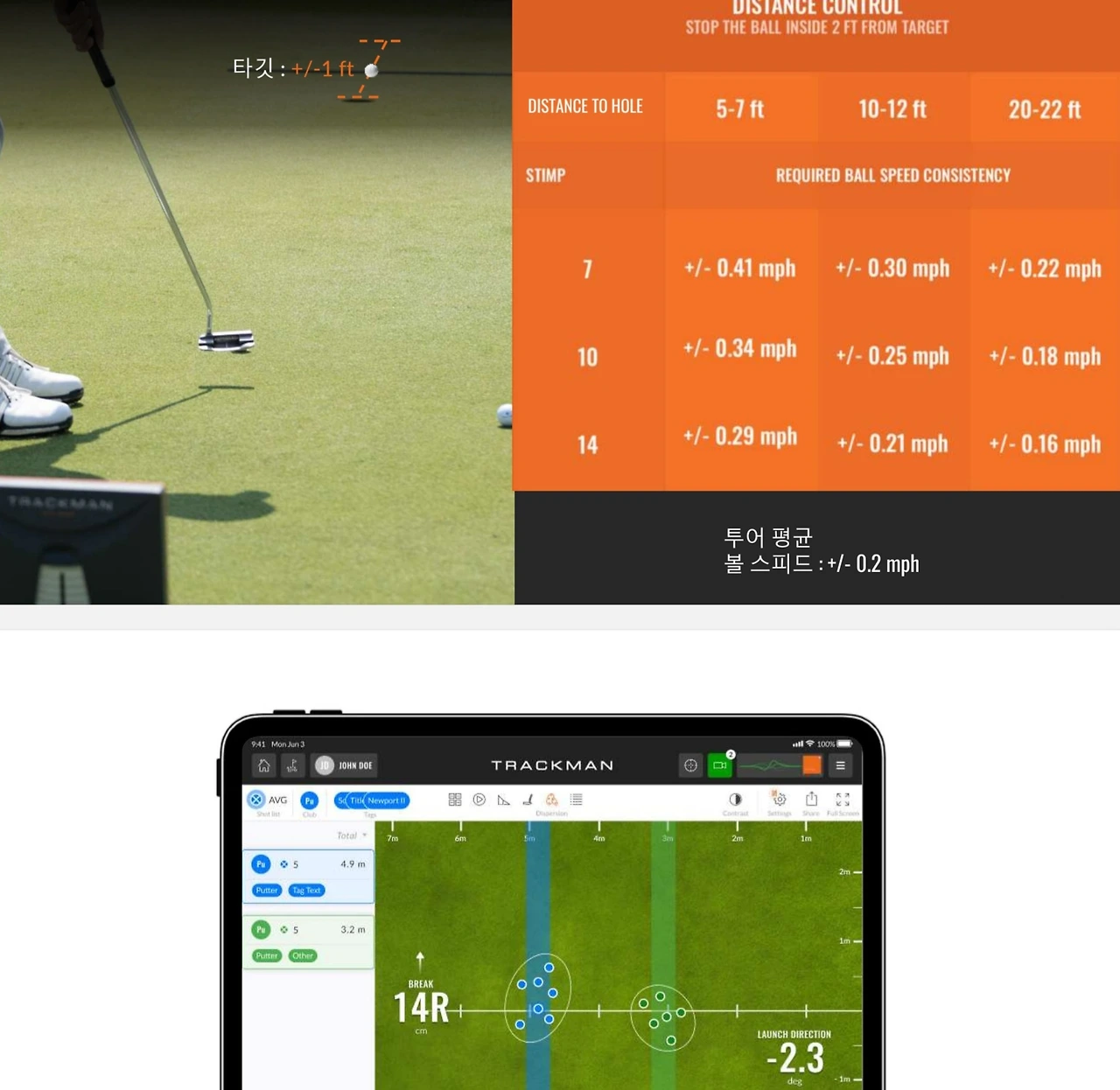 구체적으로, Skill Zone에서 소개될 AP핵심표준 322에 부합하는 Speed를 정립하면 자신만의 표준이 형성되는데, 프로골퍼는 퍼터클럽 data(클럽스피드, 백스윙타임, 백스트로크 랭스, 포워드 스윙타임, 템포, 다이내믹 라이)와 볼 data(런치디렉션, 볼스피드, 스키드 디스턴스, 롤스피드, 스피드드롭, 롤%, 이펙티브 stimp, 사이드, 디스턴스, 브레이크)를 제공하는 TRACKMAN 분석시스템을 통해 검증할 수 있어.
