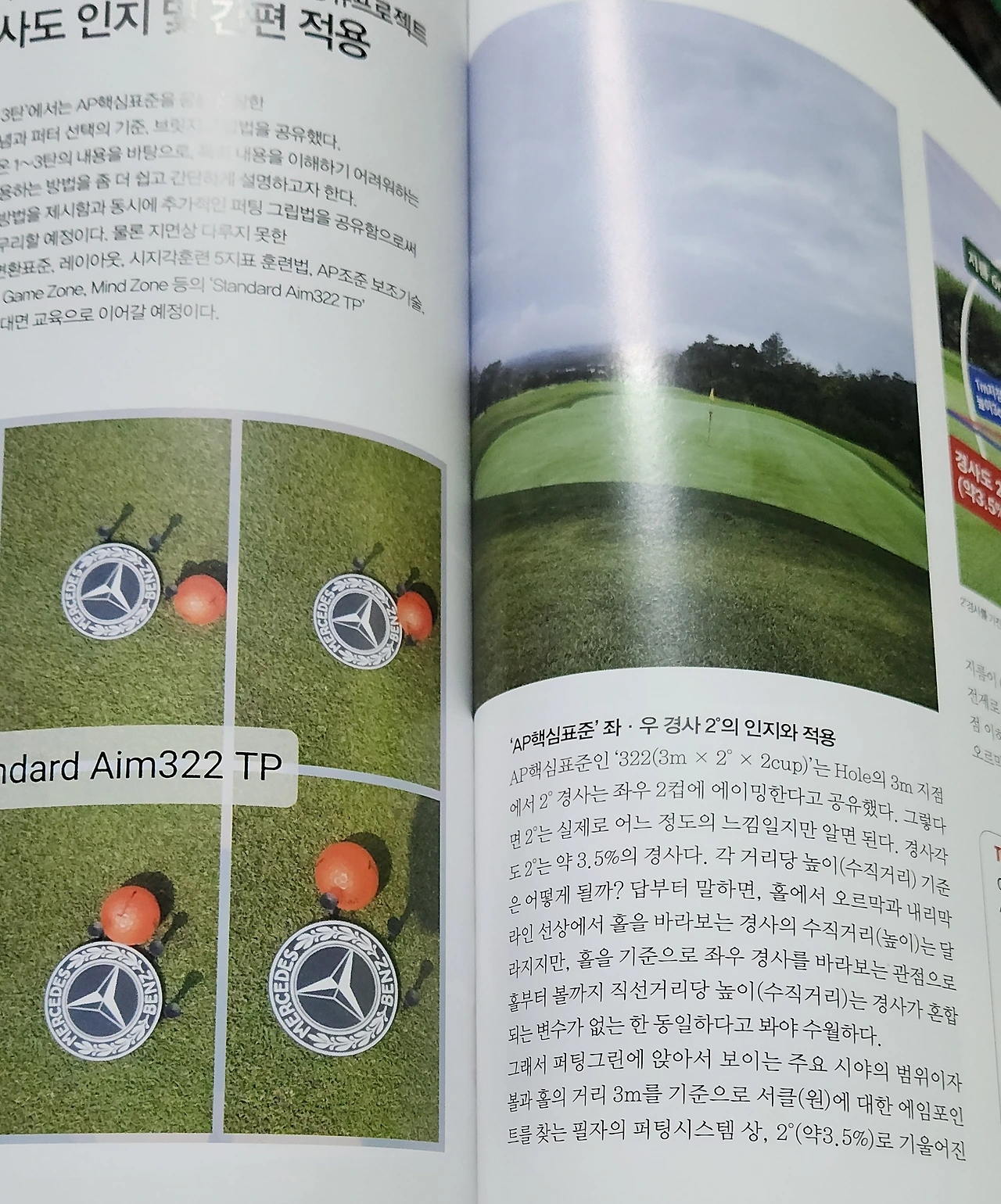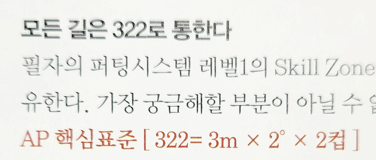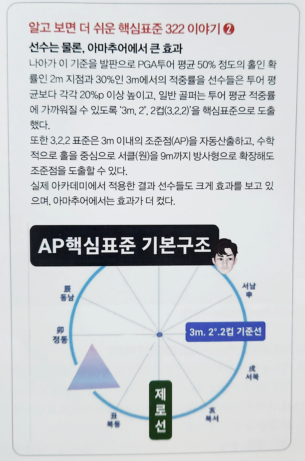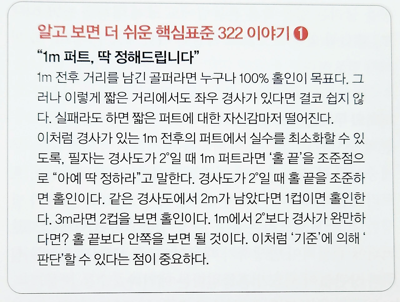 무엇보다 중요한 것은 퍼팅시스템 이름처럼 오랜 기간 현장에서 수없이 익히고 테스트한 데이터를 바탕으로 가장 효율적이고 효과적인 그린리딩 기준을 수치로 핵심표준화(322)했어. 모든 길은 하나로 통하듯이, 모든 퍼팅은 '핵심표준'으로 통하도록!