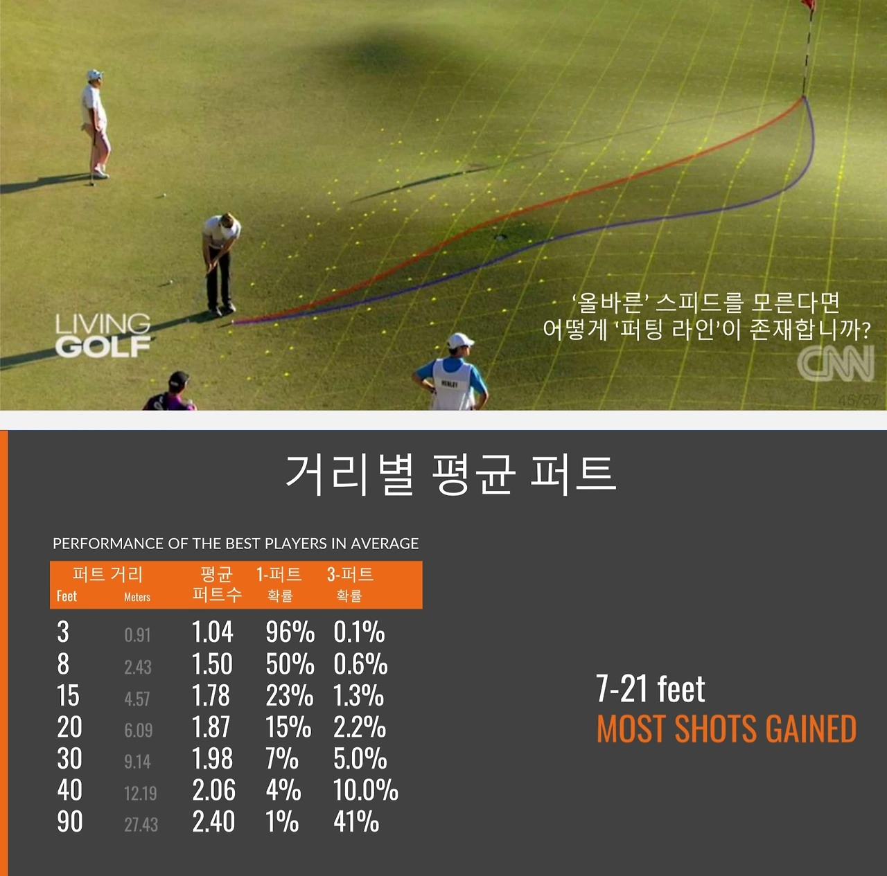 여기에 각종 변수(거리, 경사도, 그린빠르기, 퍼터, 스트로크, 라이 등)에 따라 AP는 확장되거나 변환되는 표준이 아주 쉽고 다양하게 시스템화되어있어. 예를 들어 중장거리 퍼팅에서 볼이 굴러가는 초기에 가장 빠르며, 중기는 속도가 유지되다가 말기(홀 1m 전후)에는 속도가 줄기 때문에 중력영향이 가장 크기 때문에 이를 읽고 적용하는 기준들이 있는 거지.