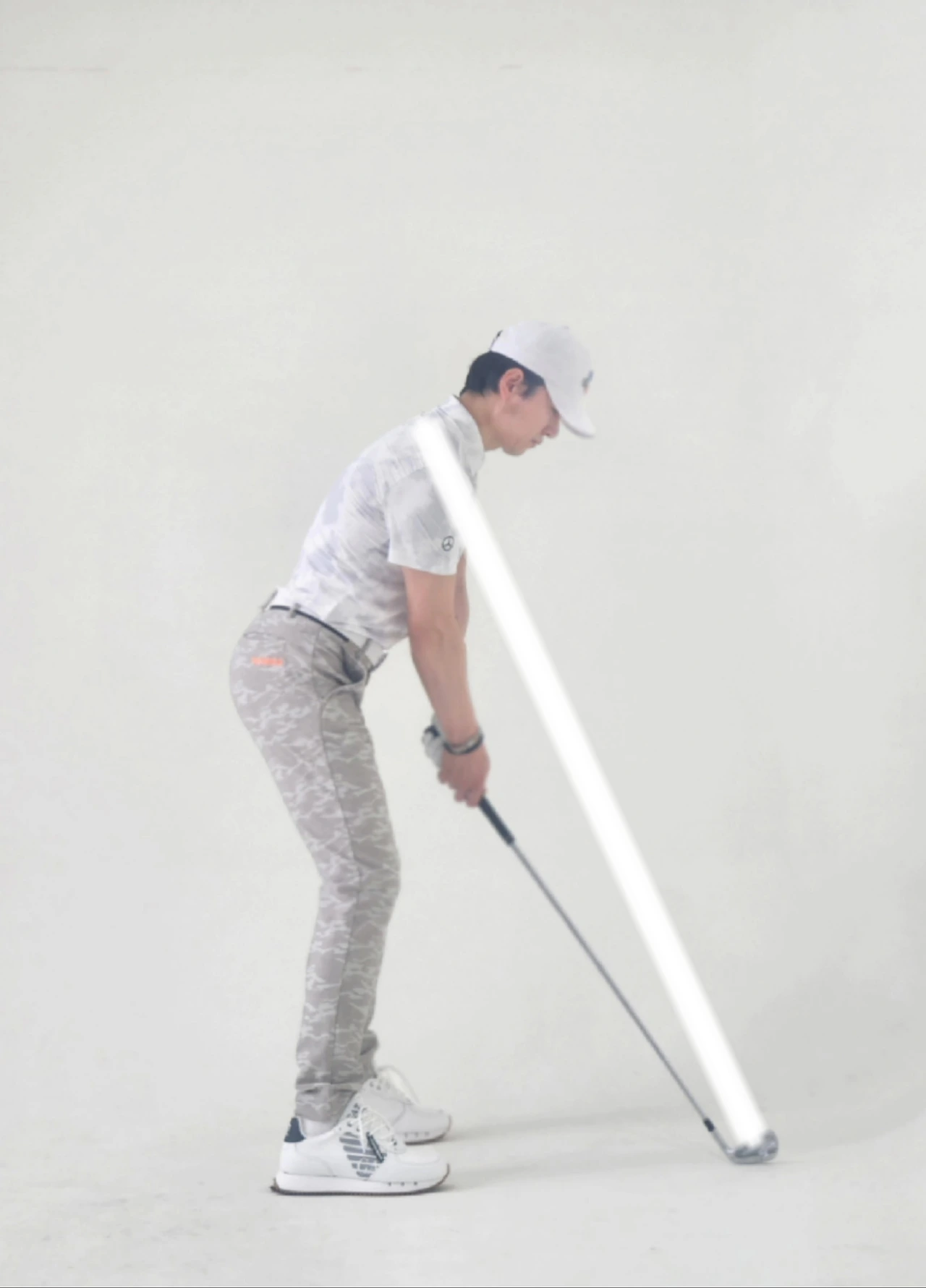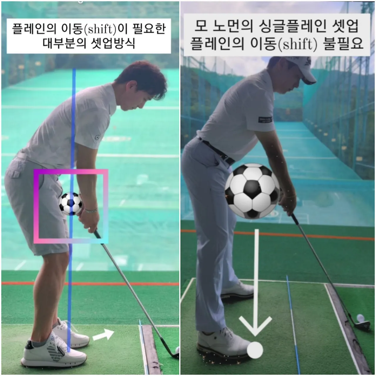 우측 사진처럼 샤프트와 팔을 평행에 가깝게 셋업하면 스윙시 플레인의 이동이 필요없다는 장점이 있다. 신장이 작을수록, 클럽이 길수록 플레인의 이동이 적은 셋업에 가까워질 수 있다.