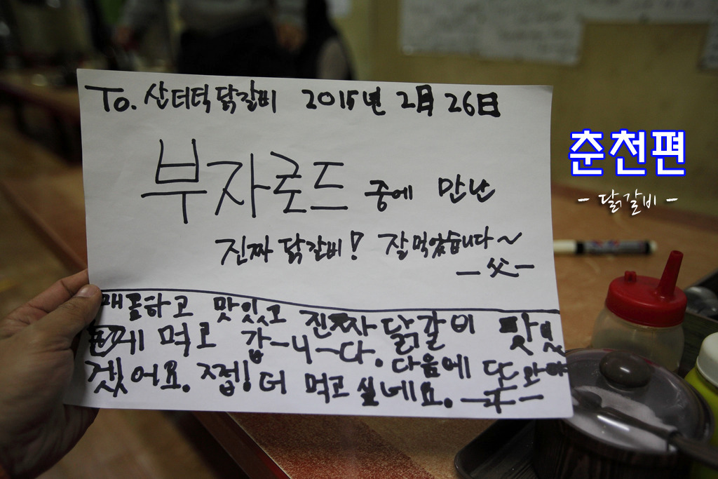 콜라도 소주도 없이 안주를 해치웠다. 술이 조금 아쉬웠지만 진우를 보살피기 위해서 어쩔 수 없었다. 진우와 여행을 다니면서 유일하게 포기한 것이 있다면 그건 술이었다. 그치만 그깟 술이 대순가. 맛있게 닭갈비를 먹고 주인한테 종이와 펜을 부탁드렸다. 방명록을 남기기 위함이었다. 에이포용지를 반으로 나눠 위에는 내가 쓰고 아래는 진우가 쓰기로 했다. 한참을 생각하더니 글을 써내려 갔다.