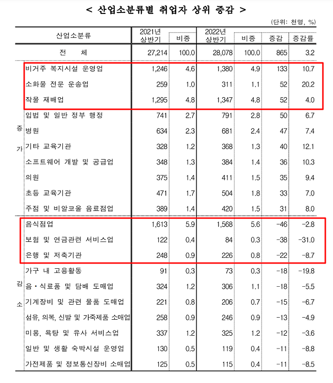2022년 상반기 취업자는 2,809만 8,000명입니다. 가장 비중이 큰 업종은 1) 음식점업 156만 8천 명(5.6%) 2) 비거주복지시설 운영업(도움이 필요한 사람에게 다양한 사회지원 서비스를 직접 제공하는 비거주 복지시설) 138만 명(4.9%) 3) 작물재배업 134만 7천 명(4.8%)입니다.