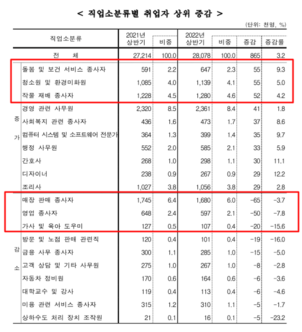 보고서 발췌1직업 소분류 별 가장 취업자가 많은 분야는 1) 경영 관련 사무원 236만 1천 명(8.4%) 2) 매장 판매종사자 168만 명(6.0%) 3) 작물재배종사자 128만 명(4.6%)입니다. 상위 증가는 돌봄 및 보건서비스 종사자, 청소원 및 환경미화원에서 5만 5천 명 증가하였고, 반면 매장 판매종사자 6만 5천 명, 영업종사자에서 5만 명, 가사 및 육아도우미에서 2만 명 감소하였습니다.