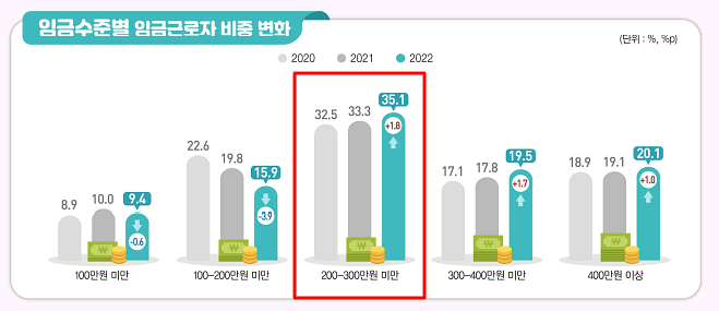 취업자 중 200-300만 원 미만의 근로자의 비중이 가장 많이 차지했으며, 200만 원 이상의 임금 근로자가 2021년보다 약간 증가하였습니다. 임금근로자 4명 중 1명인(25.3%)는 월급이 200만 원도 되지 않습니다. 숙박과 음식점에서 월급 100만 원 미만 근로자의 비중이 가장 높았고 전문, 과학, 기술 서비스업 종사자가 월급 400만 원 이상 근로자 중 가장 많았습니다.