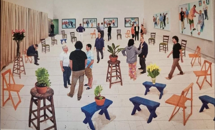 호크니의 위 그림이 보이지요. <4개의 파란색 의자>라는 그림은 호크니가 조수들과 함께 일하는 공간인 로스앤젤레스 작업장입니다.