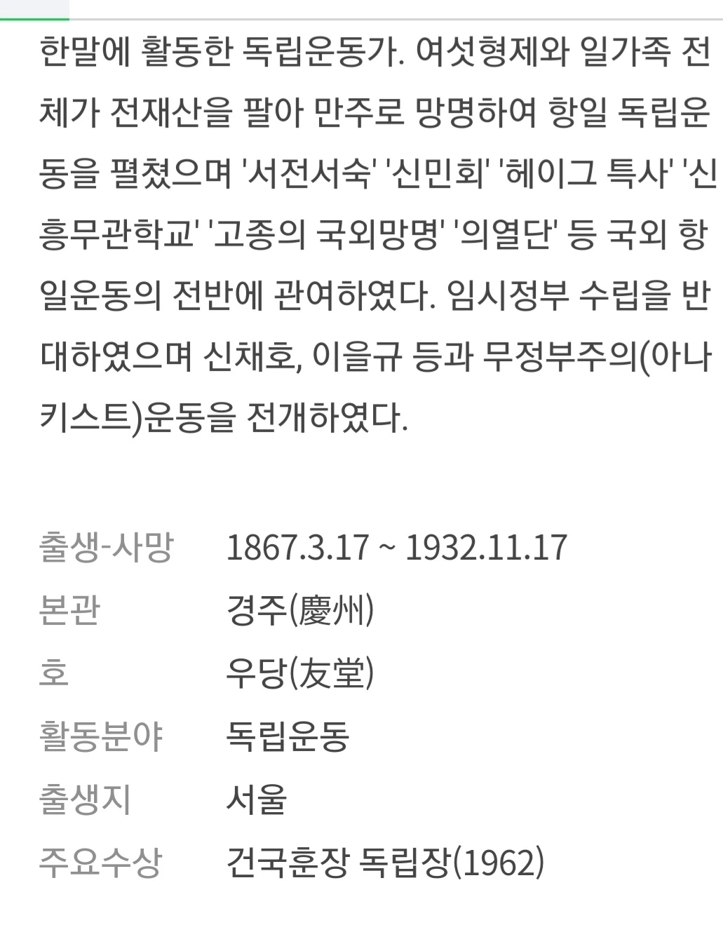 한 줌의 흙으로 이 세상을 떠난 분이지만, 그 정신만큼은 하늘에서 오늘도 혁혁하게 빛날 고 우당 이회영 선생님을 생각한다.