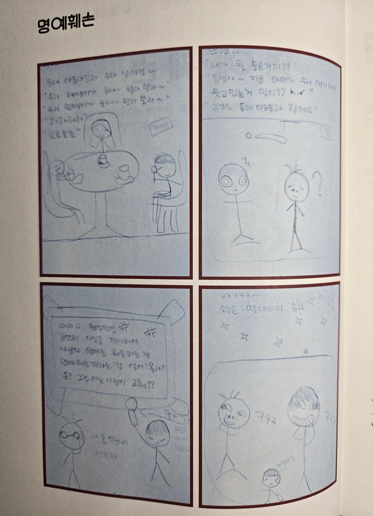 "엄마들이 함께 만나서 아이들 흉을 보며 수다 떠는 행위와 그 행위에 적용되는 법조문으로 엄마를 무력화시키는 딸과 아들의 모습을 그려보는 것이 어떨까? 괜찮지? 그림 먼저 그려주면 엄마가 글을 쓸게."라고 했다.