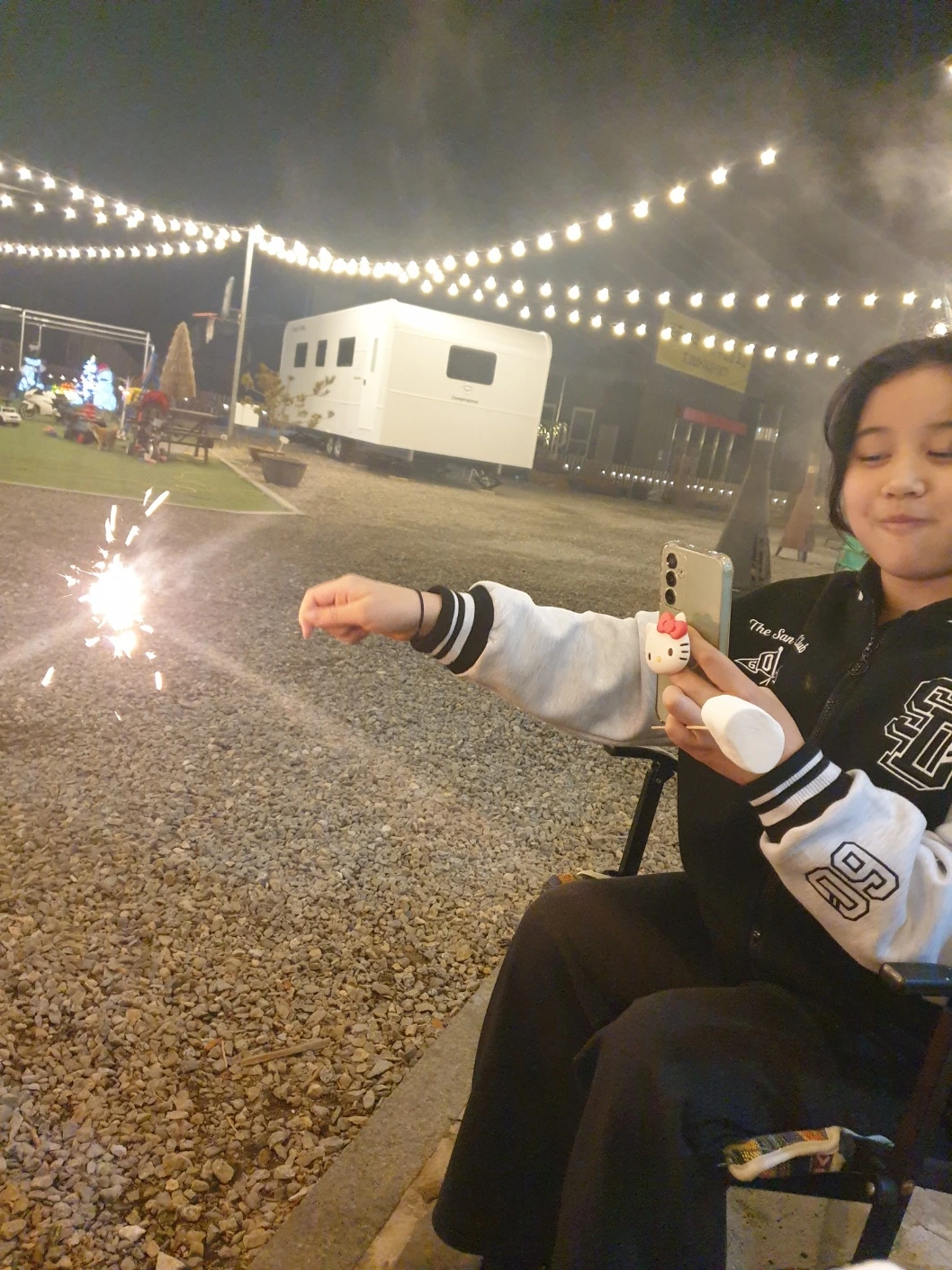 빨간 불빛 아래 흔들리는 아이들의 그림자와 천진난만한 목소리가 텐트 안을 가득 채웠다.