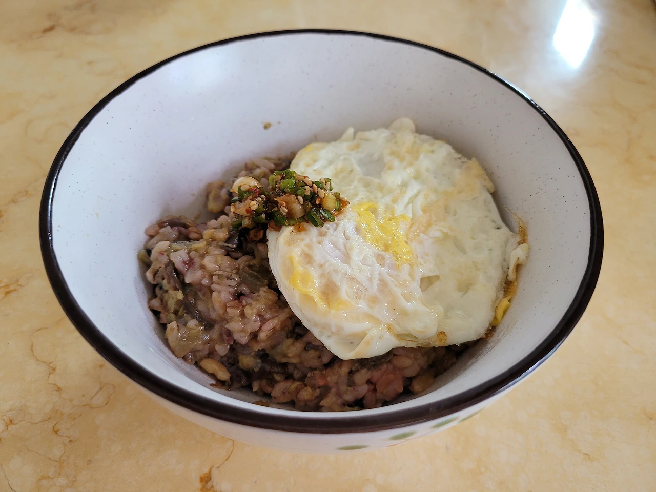 가지밥 완성 (출처 : 김재호) 잠시 더위를 피해 쉬고 있다가 취사가 완료되었다는 반가운 목소리가 들리면, 다들 먹고 싶은 양만큼 밥을 덜어서 그릇에 담습니다. 계란 프라이로 단백질과 색깔을 보충하고, 반찬은 잘 익은 열무김치 하나면 충분합니다.