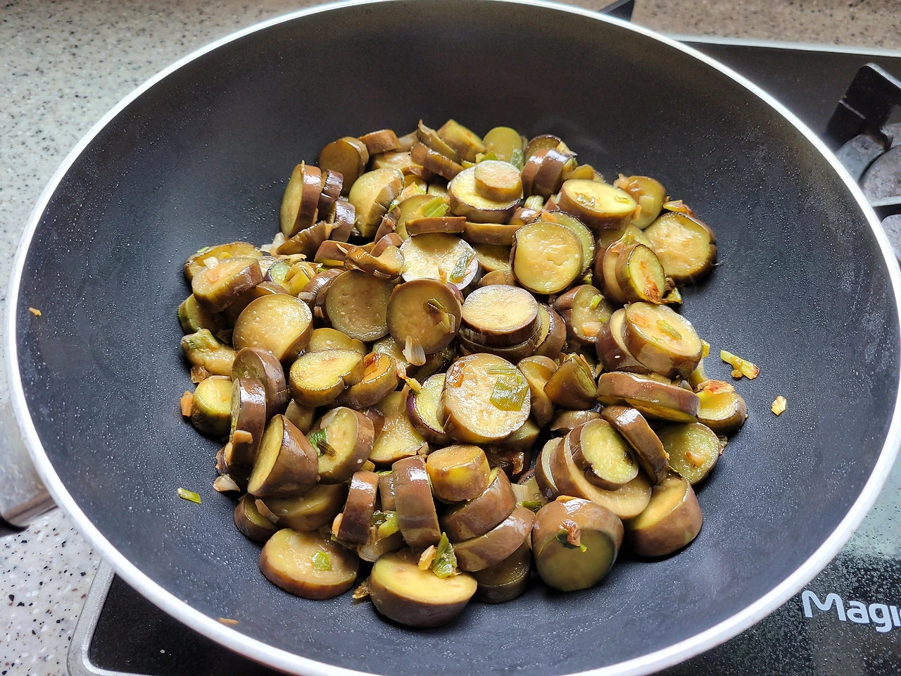 그 사이에 아내는 파기름을 낸 후 준비한 가지를 넣고 숨이 죽을 때까지만 볶아 줍니다. 제가 잘 손질해서 냉동실에 넣어둔 대파도 함께 거듭니다. 간은 간장과 굴소스를 이용하더군요.