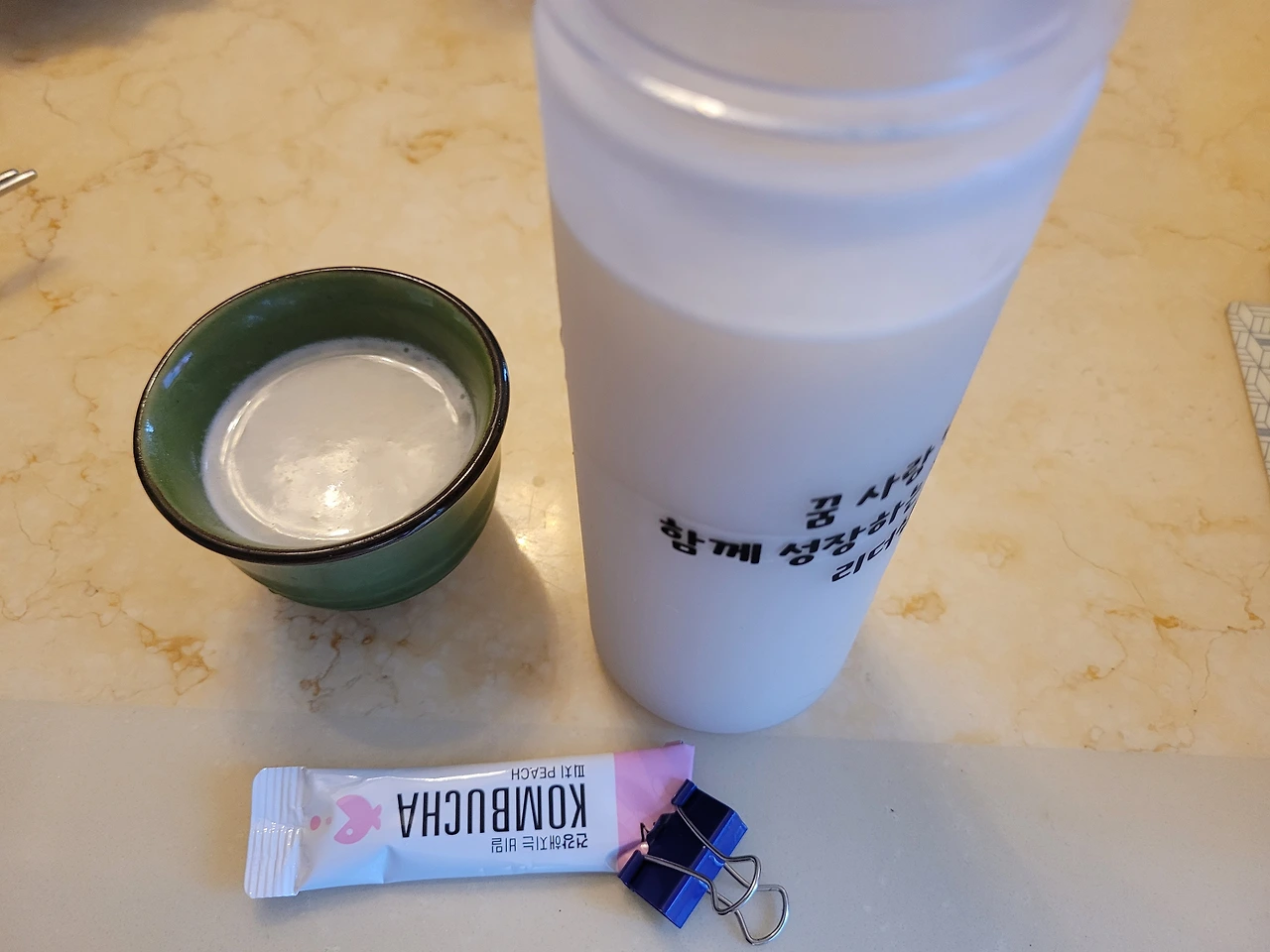 그럴싸한 색깔의 막걸리 대용품이 탄생하는 순간입니다. 아내의 반응이 가히 폭발적입니다.
