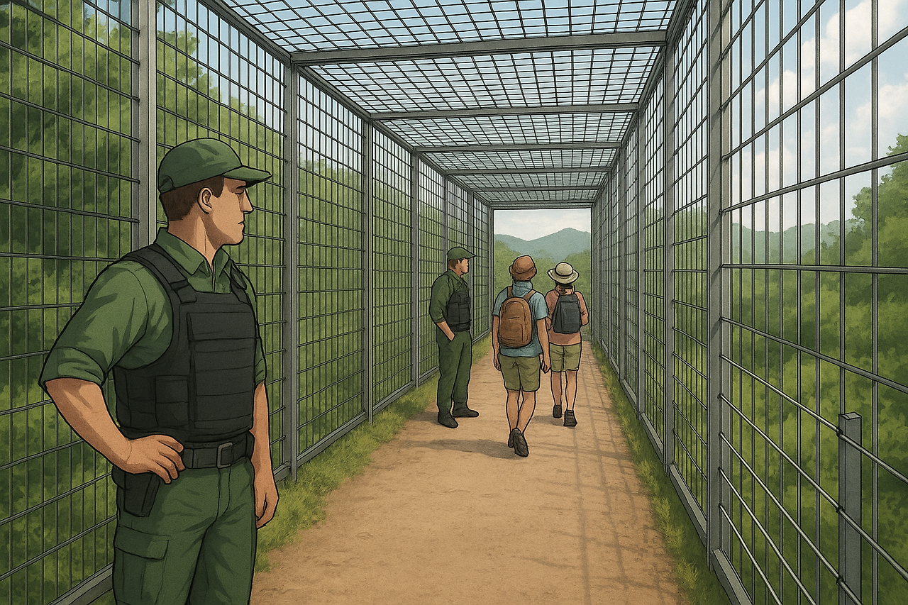 “아뇨 그 반대입니다.관광객들이 보고 싶어하는 지역에 길을 만들고 그 길에 철창으로 벽과 천장을 만드는 겁니다. 자연을 가두는 것이 아니라 인간을 가두는 거죠,틈틈히 안전요원을 배치해 혹시 모를 사고에 대비하고요.”