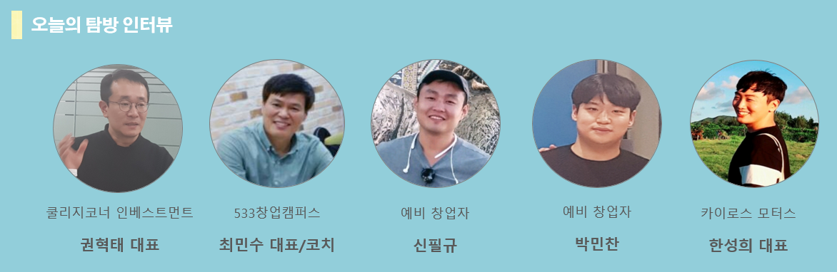 첫 번째 글은 한국의 대표 벤처캐피털인 쿨리지코너 인베스트먼트의 권혁태 대표를 533창업캠퍼스 최민수 대표코치, 예비창업자인 신필규 님, 박민찬 님, 카이로스 모터스 한성희 대표 4인이 탐방 인터뷰를 진행했습니다.