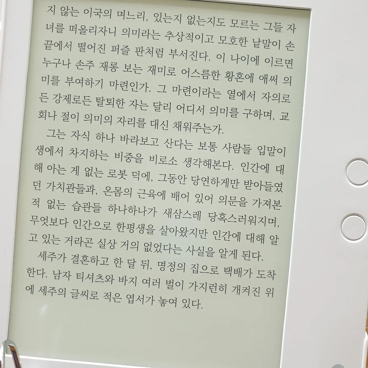 #리디 에서 동봉해서 보내주신 거치대에 올려 읽거나 그냥 들고 읽을 때도 터치로 넘기는 게 상당히 편했습니다. 보통 300쪽 책이면 150번을 넘겨야 하는데, 150번만 두들기면 되니... 아... 그쵸, 제가 노쇠하여 그런 것도 있지만 600쪽 책이면 300번을 넘겨야 하고, 그게 한달이면 ㅎㅅㅎ 꺅.