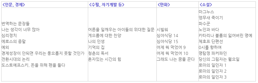 소설책은 잘 읽지 않는 편이라고 생각했는데 가장 권수도 많고 활자수로도 소설이 가장 앞섰다