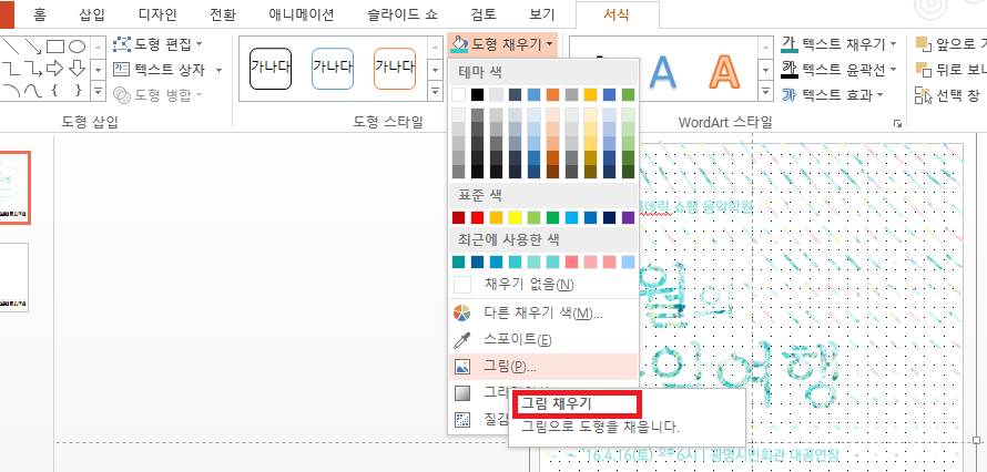 2 - [배경 도형 그룹 선택] - [서식] - [도형채우기] - [그림] - [원하는 이미지 선택]