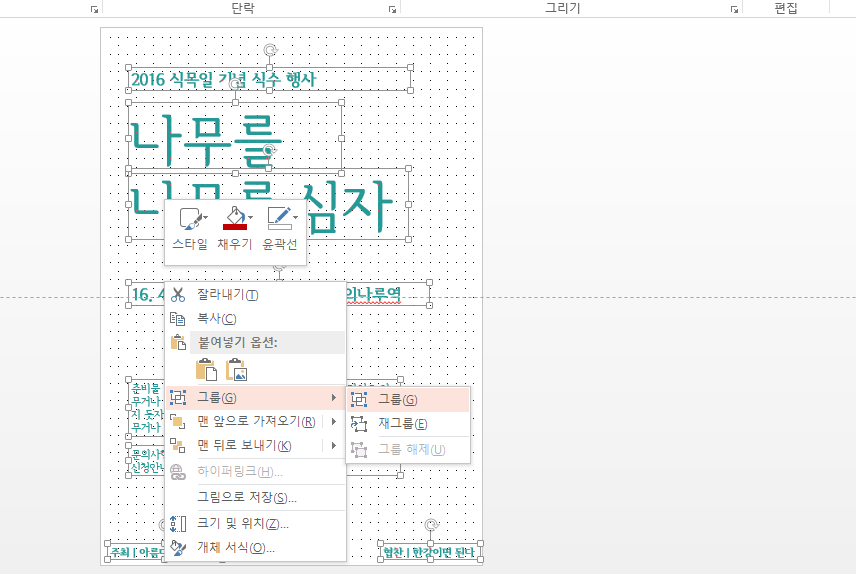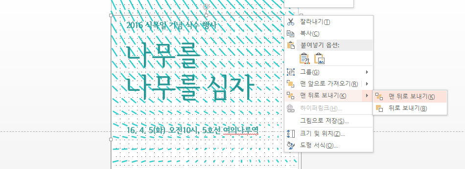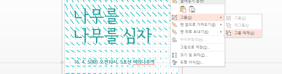 이제 배경과 문구를 합칩니다. 처음부터 배경위에 글을 입력하지 않은 건 슬라이드에 도형과 글상자가 많아지면 작업 속도가 느려지기 때문입니다. 앞서 적은 바와 같이 배경은 모두 도형이니까요.