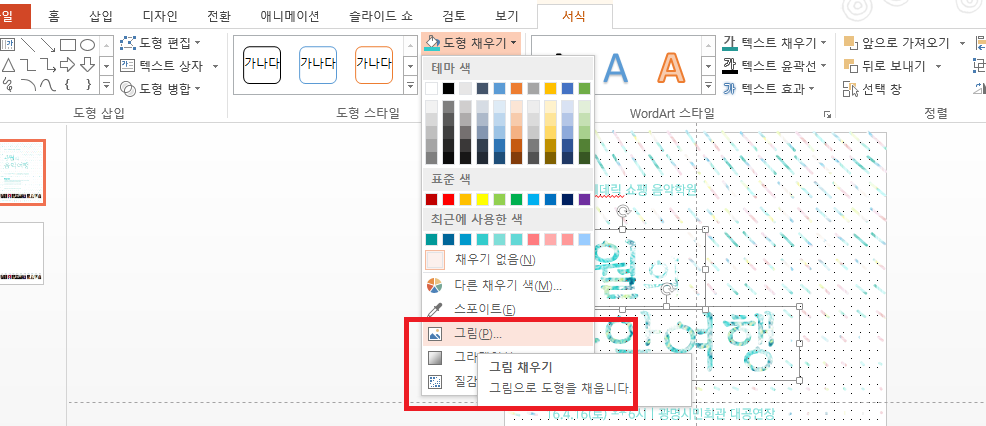 1 - [글상자 선택] - [서식] - [텍스트채우기] - [그림] - [원하는 이미지 선택]