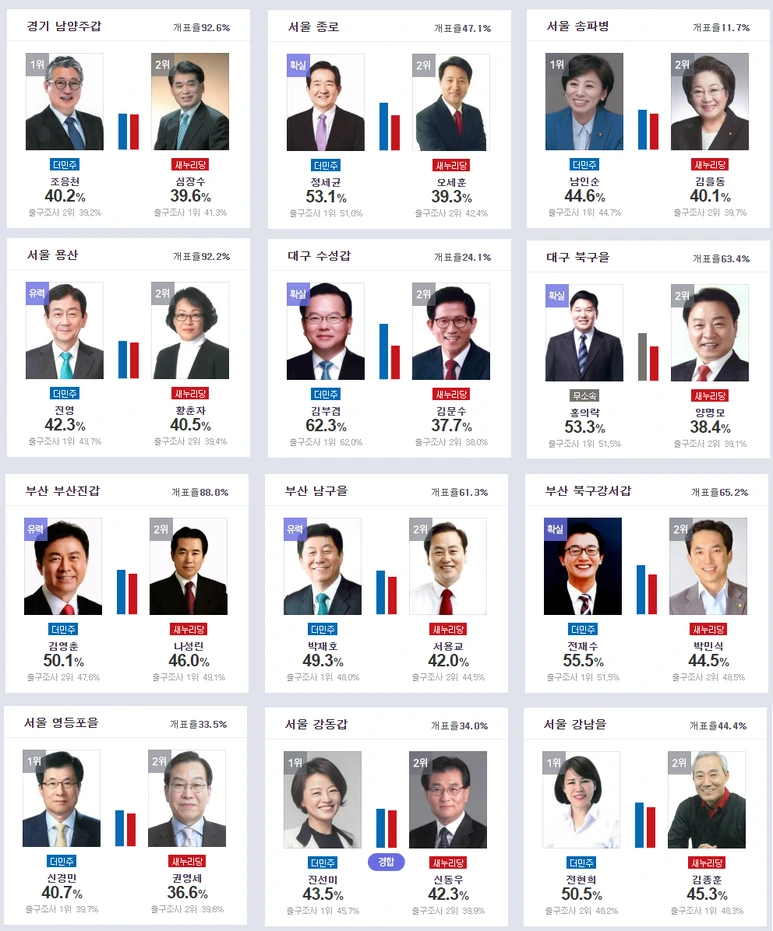 19대였나... 정동영에 밀려 타지역 공천을 받았지만 의리를 지키기 위해 강남을에 머물렀던 전현희 후보가 20대에 당선되었다. 종로 정세균, 대구 김부겸, 부산 전재수, 순천 이정현에 비견되는 결과가 아닐까 한다. 이제 이인제도 떨어졌다. 어떤 기사를 보니 피닉제라고 하던데 말이다. 만세다.