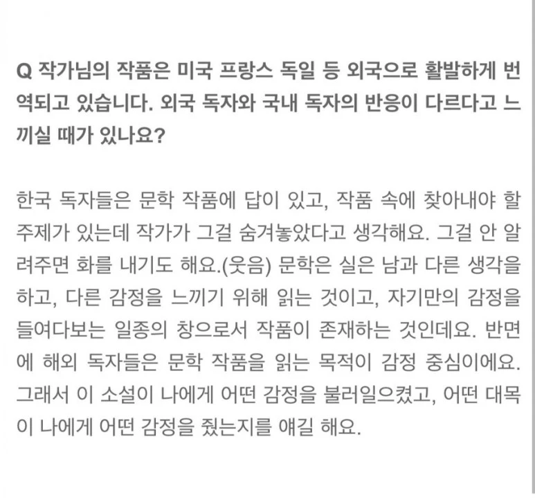 독자 개개인이 느끼는 감정의 스펙트럼이 다양하다는 걸 인정하는 투로 말하는 김영하 작가 본인이 호 - 불호에 이르는 독자의 다양한 평가에 대해서 국내-해외로 나눈다는 사실은 실소를 불러 일으킨다.