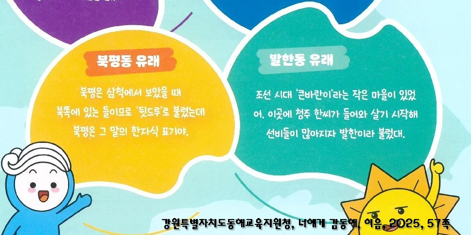 조선 시대 ‘큰바란이’라는 작은 마을이 있었어. 이곳에 청주 한씨가 들어와 살기 시작해 선비들이 많아지자 발한이라 불렀대. (강원특별자치도동해교육지원청, <너에게 감, 동해>, 2025, 57쪽)