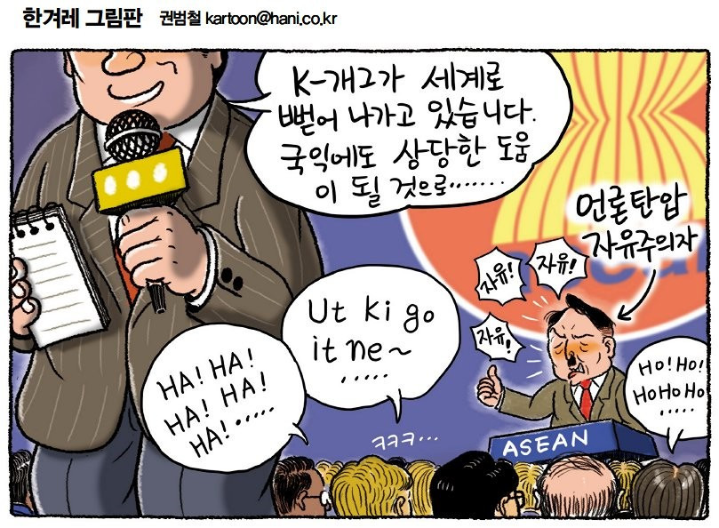 여러 말 더 할 것도 없다. 부끄럽다. 지금 대통령실이 하는 짓거리는 어떻게 언론을 길들이고 재갈 물리기를 하는지를 잘 보여주는 본보기가 되고 있다. 이참에 일본식 영어라는 탈을 벗고 본디 '개그'의 뜻으로 돌아가려고 했을까. 그랬다고 하면 손뼉 짝짝짝 쳐줄 일이다. 하지만 지금까지는 이 나라를 우스운 꼴로 만드는 ‘케이 개그’일 뿐이니 과연 이 노릇을 어찌하면 좋은가.