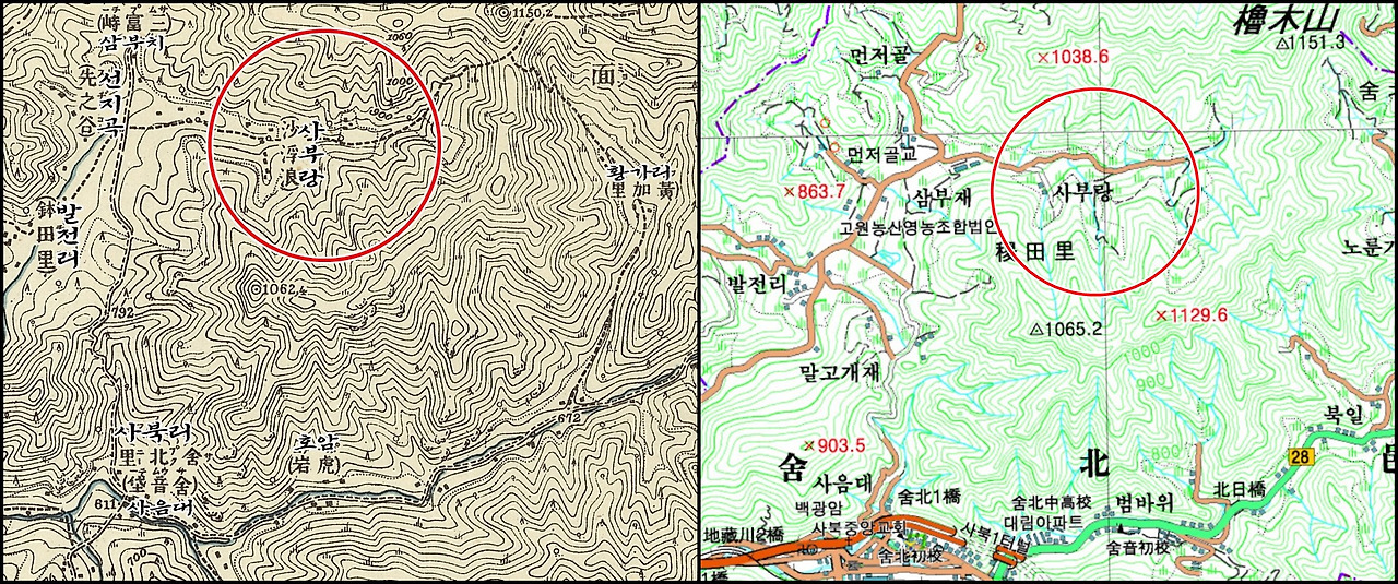 이제 마무리하자. ‘사부랑’은 ‘사이’를 뜻하는 옛말인 ‘삿/샅’과 ‘산’을 뜻하는 옛말 ‘불/붇’과 ‘안’을 묶어 지어낸 땅이름이다. 처음엔 ‘샅불안’이다가 그다음엔 ‘삿불안’이다가 ‘사불앙’이다가 ‘사부랑’이다가 ‘사부랭이’도 되었다. 시간이 흘러 흘러 먼 뒷날에 가면 또 다른 이름이 될지 알 수 없지만, 그래도 산 사이 골 안에 있는 마을이란 사실은 바뀌지 않는다.