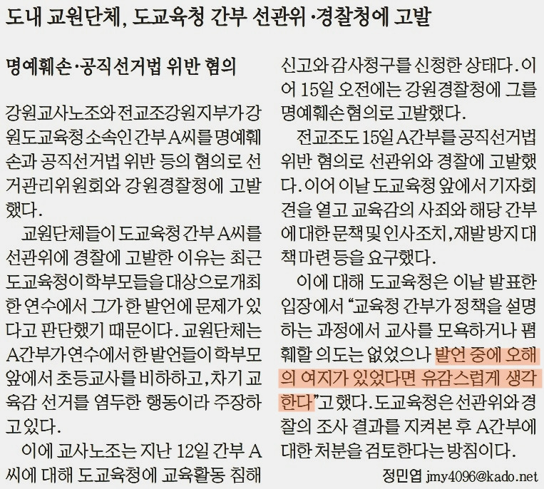 이 말을 미안하다, 잘못했다는 말로 받아들일 수 있을까. 오히려 모욕하거나 낮잡을 마음은 병아리 눈곱만큼도 없는데 잘못 알아들은 쪽이 칠뜨기라서 오히려 도교육청이 더 섭섭하다고 떠드는 꼴이다. 무엇보다 ‘오해의 여지가 있었다면’이란 말은 조금도 잘못한 게 없다는 말이 아니고 무엇인가.