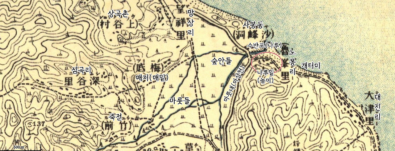 시에 나오는 ‘반포(盤浦)’는 소반 반(盤) 자, 개 포(浦) 자로 쓴 말로 ‘숲안포>숩안포>수반포>소반포’처럼 읽을 수 있다. 숲안들은 고속도로 가에 있는 들판으로 망상초등학교 앞들이다. ≪동해시 망상 남구만 유적과 기층문화≫에 “망상역과 국도 일대 ‘수반포’ 호수의 변두리”라고 하면서 “수반은 호수가 있던 곳이며, 수반답은 호수가 논으로 바뀐 곳, 수반들은 들판을 말한다”(167쪽)이라고 했다. 하지만 ‘수반포’는 호수 변두리를 가리키는 말이라기보다 ‘포구’다. 배달말로는 배가 드나드는 ‘개’요 ‘나루’다. 더욱이 마루내(마상천)과 숲안들에서 흘러온 물이 모였다가 바다로 빠져나가는 잘록한 물목으로 땅 생김새로 보면 노루목이다. 나루가 되었든 노루목이 되었든 그 아래쪽에 있는 마을이 바로 ‘노봉’이다. 그러니 ‘노을 지는 산’이라고 해서 ‘놀뫼>놀산>노산>노봉’처럼 되었다는 설명은 아무리 봐도 발 디디고 선 땅을 살피지 않고 지어낸 말로밖에 안 보인다. 마을 뒤로 작은 산이 있지만 어달산 북쪽이 흘러내린 산자락 끝으로 산이라기보다 언덕에 가깝다. 그런데 노을 지는 경치가 아름다운 산이라니 얼토당토 않다.