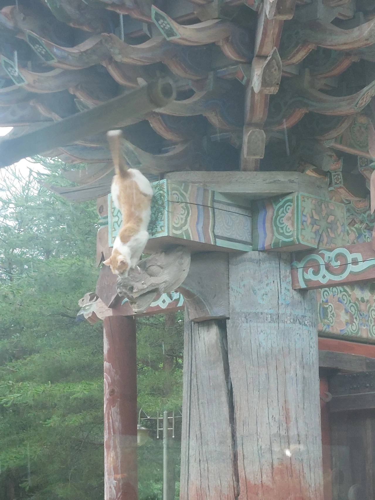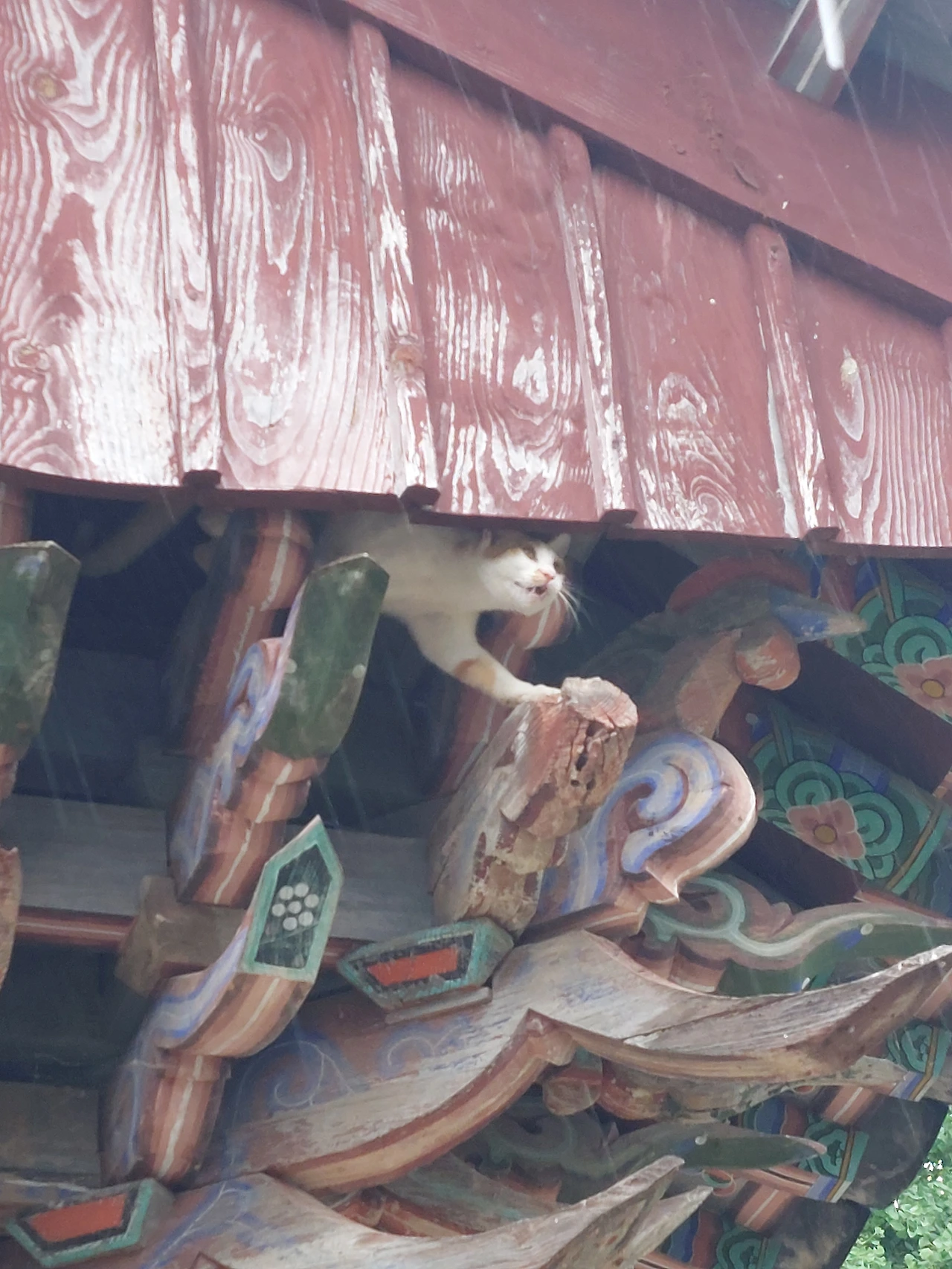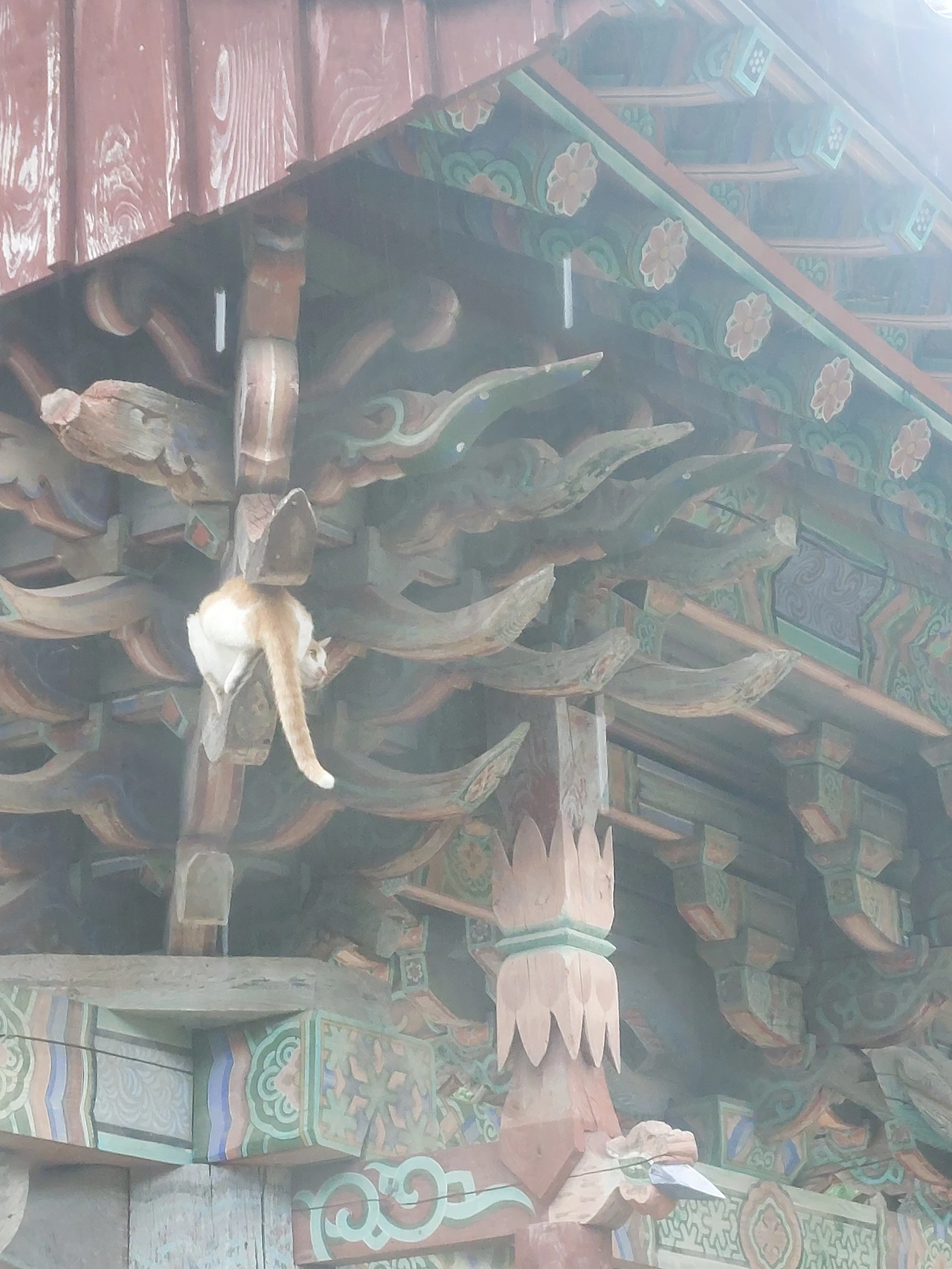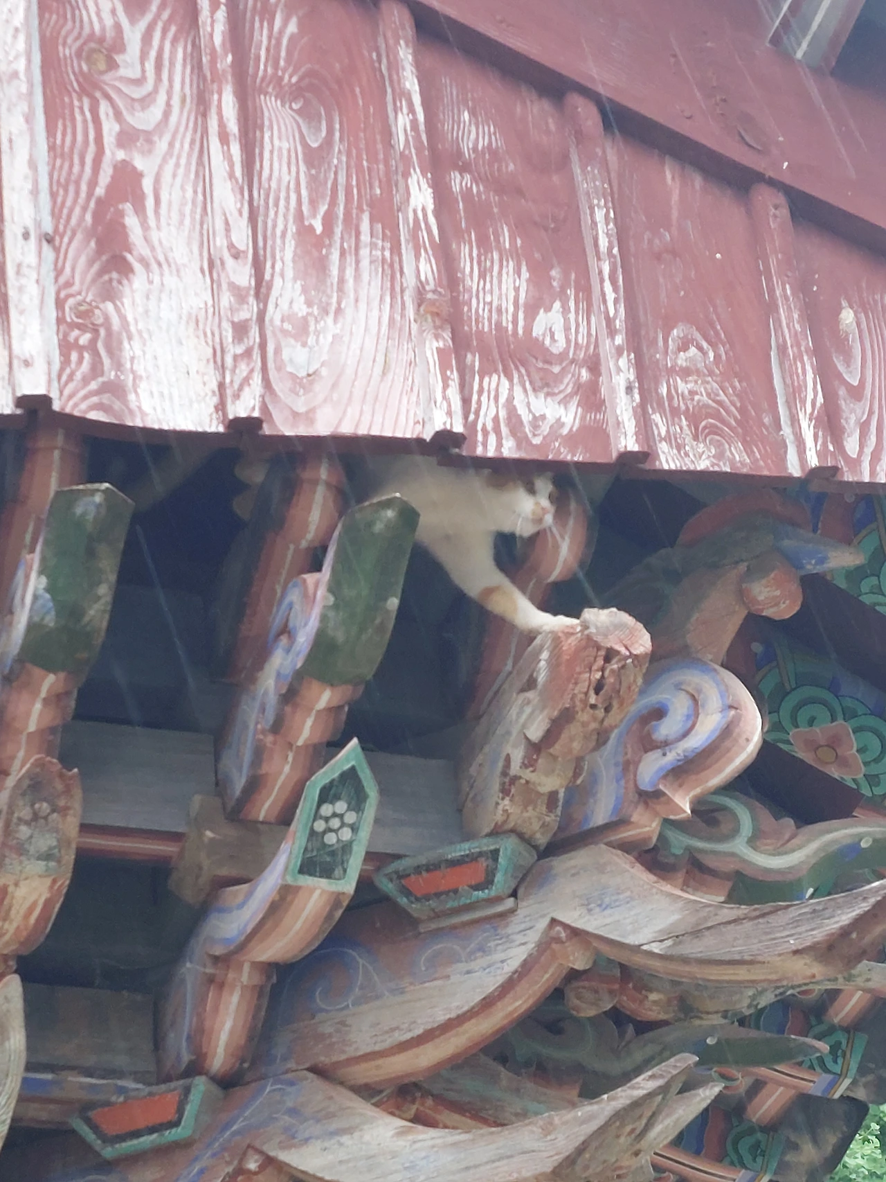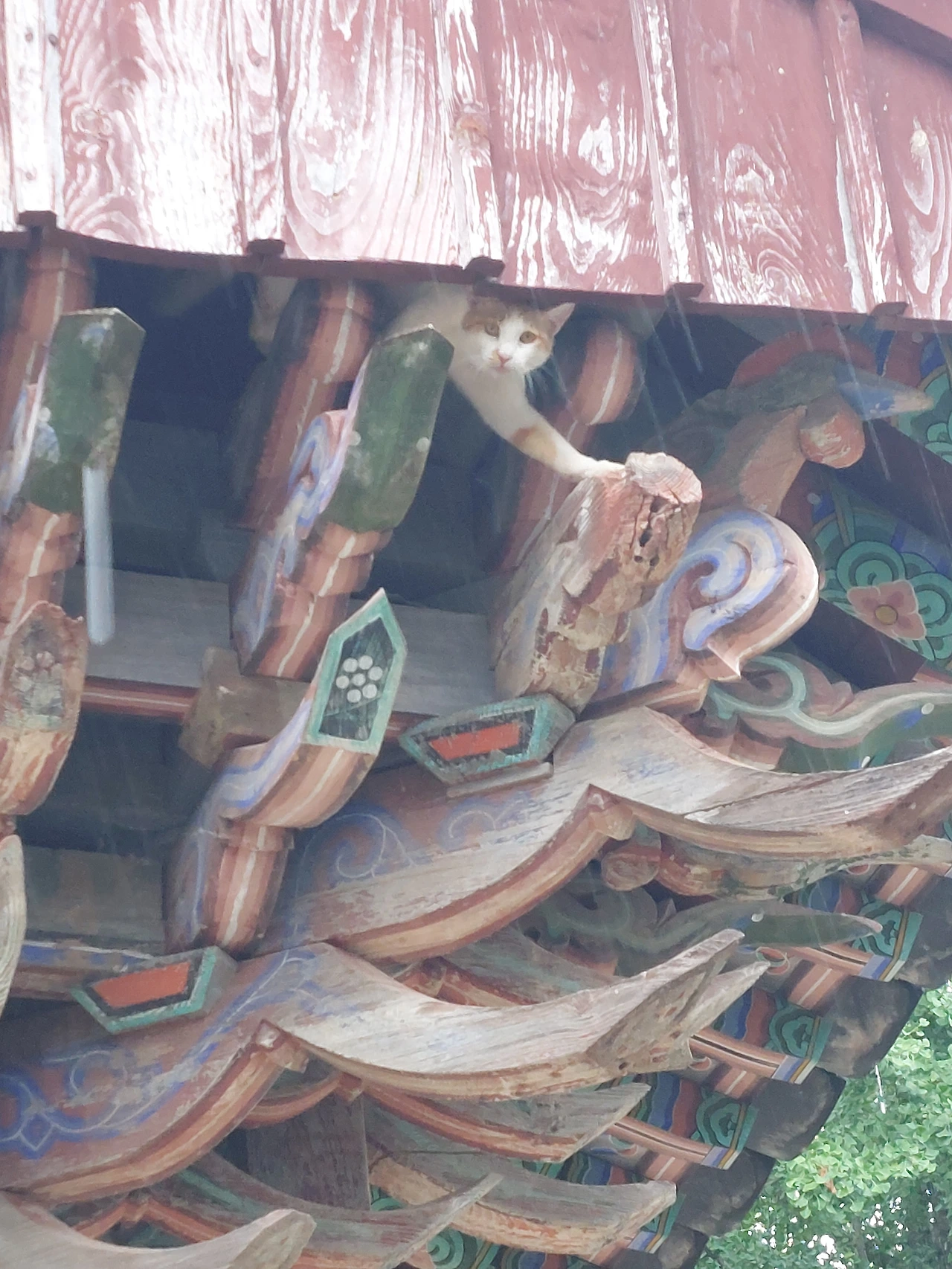 비가 속수무책으로 내리다 보니 고양이들이 보이지 않는다. 걱정이 되어 이름을 불렀더니 목소리만 가늘게 들려온다. 목소리는 들려오는데 어딘지 알 수가 없다. 좀처럼 보이지 않아서 두리번거리니 아, 글쎄 위험 천만한 곳에서 나를 애처롭게 바라본다. 오늘, 갑자기 장맛비가 쏟아져서 말랑이도 미처 비를 피할 사이가 없었나 보다. 지상에서 대략 8~9m 위에 놓인 일주문이다.