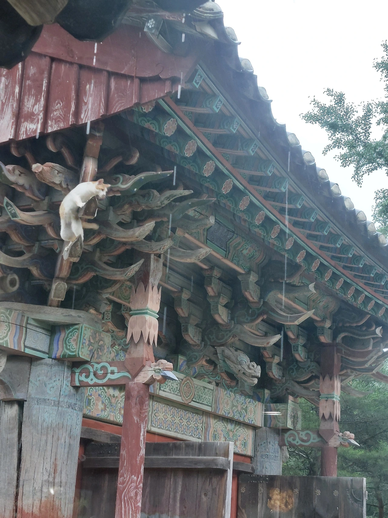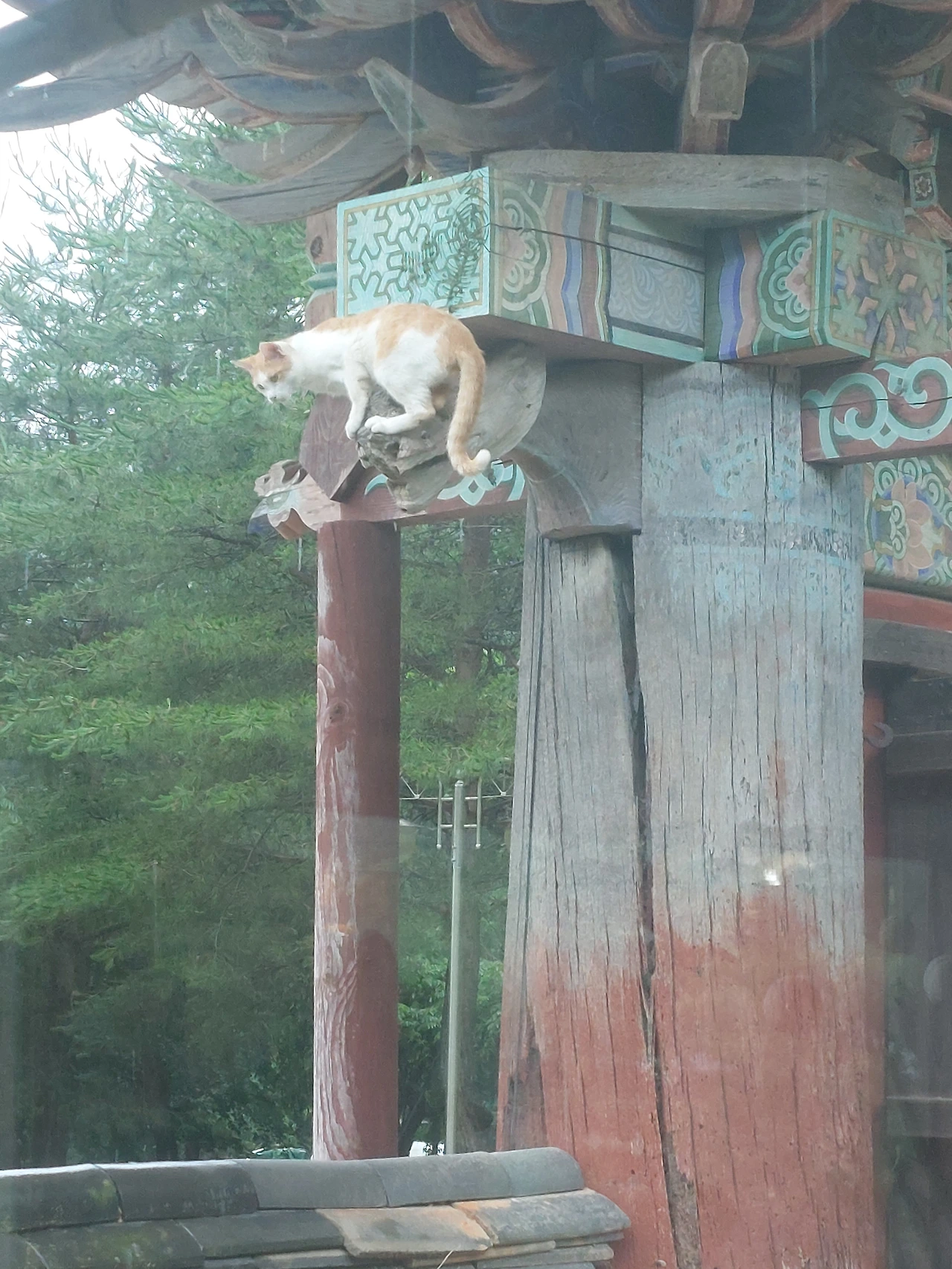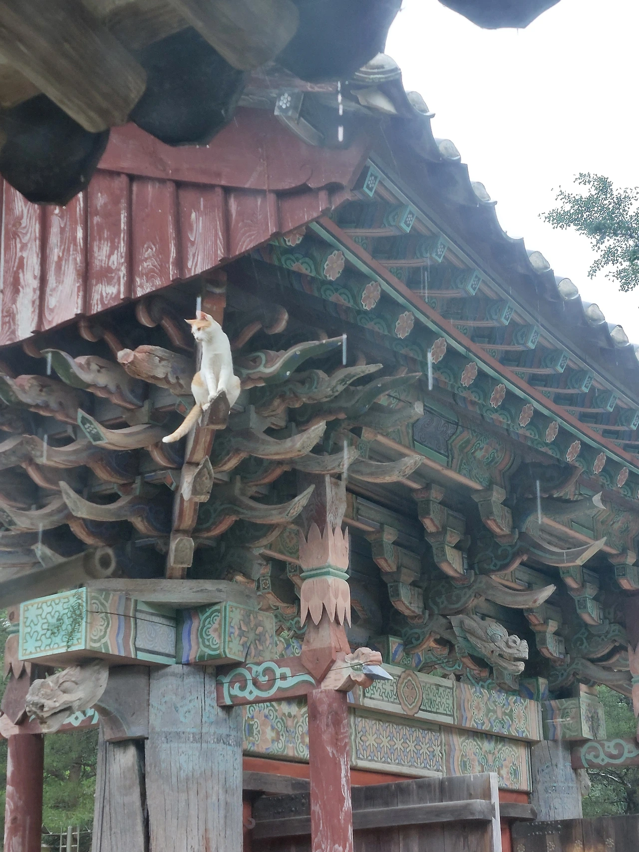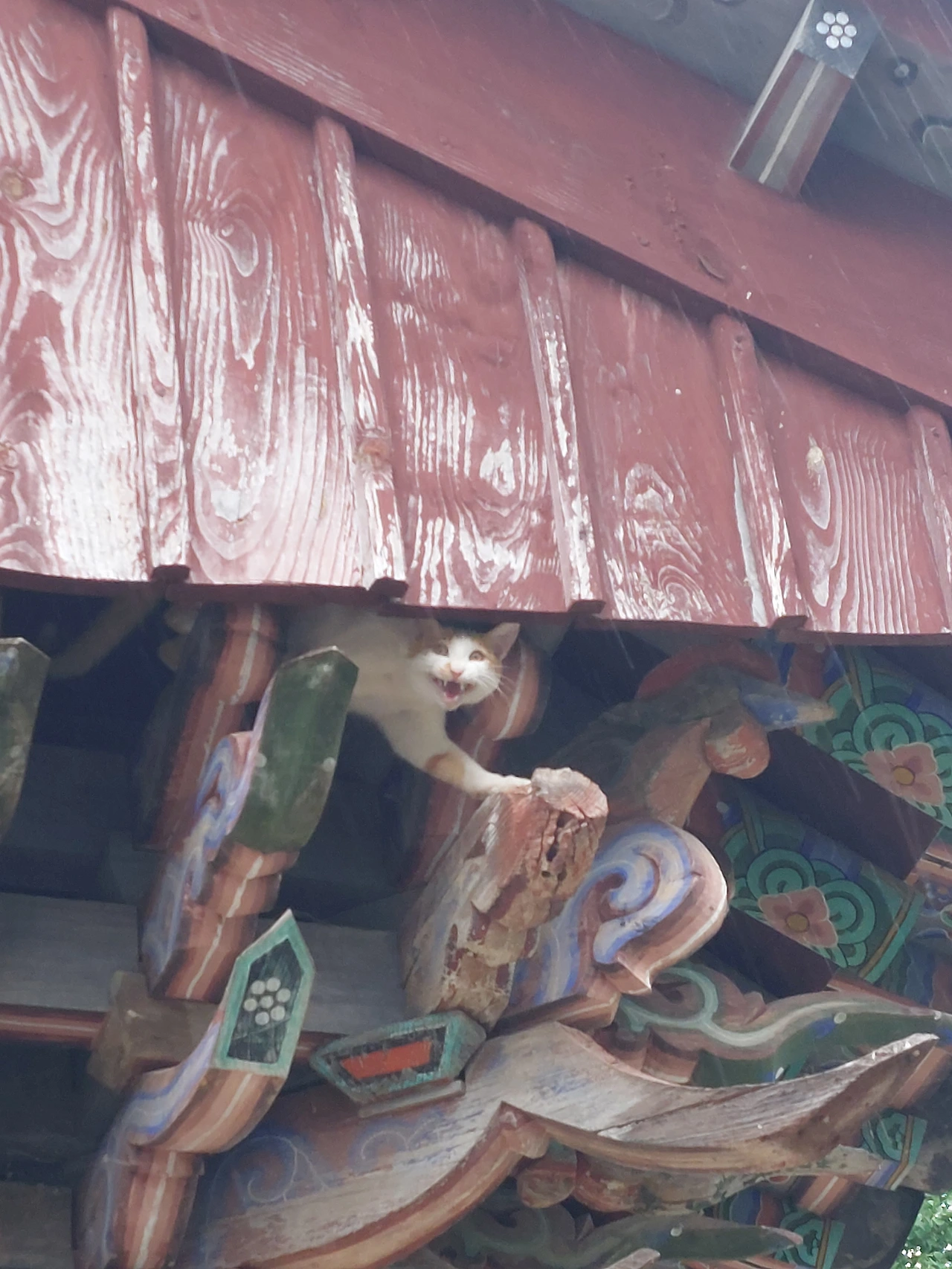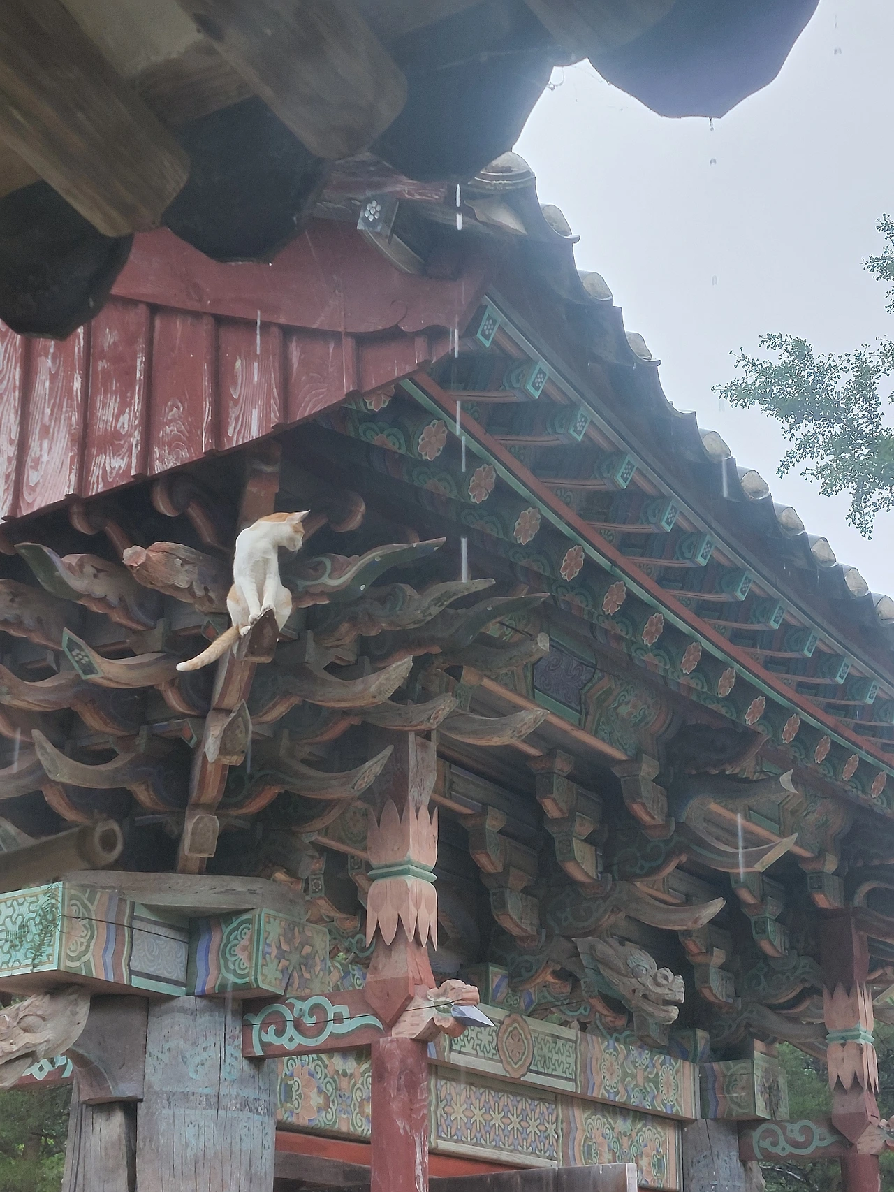 비가 속수무책으로 내리다 보니 고양이들이 보이지 않는다. 걱정이 되어 이름을 불렀더니 목소리만 가늘게 들려온다. 목소리는 들려오는데 어딘지 알 수가 없다. 좀처럼 보이지 않아서 두리번거리니 아, 글쎄 위험 천만한 곳에서 나를 애처롭게 바라본다. 오늘, 갑자기 장맛비가 쏟아져서 말랑이도 미처 비를 피할 사이가 없었나 보다. 지상에서 대략 8~9m 위에 놓인 일주문이다.