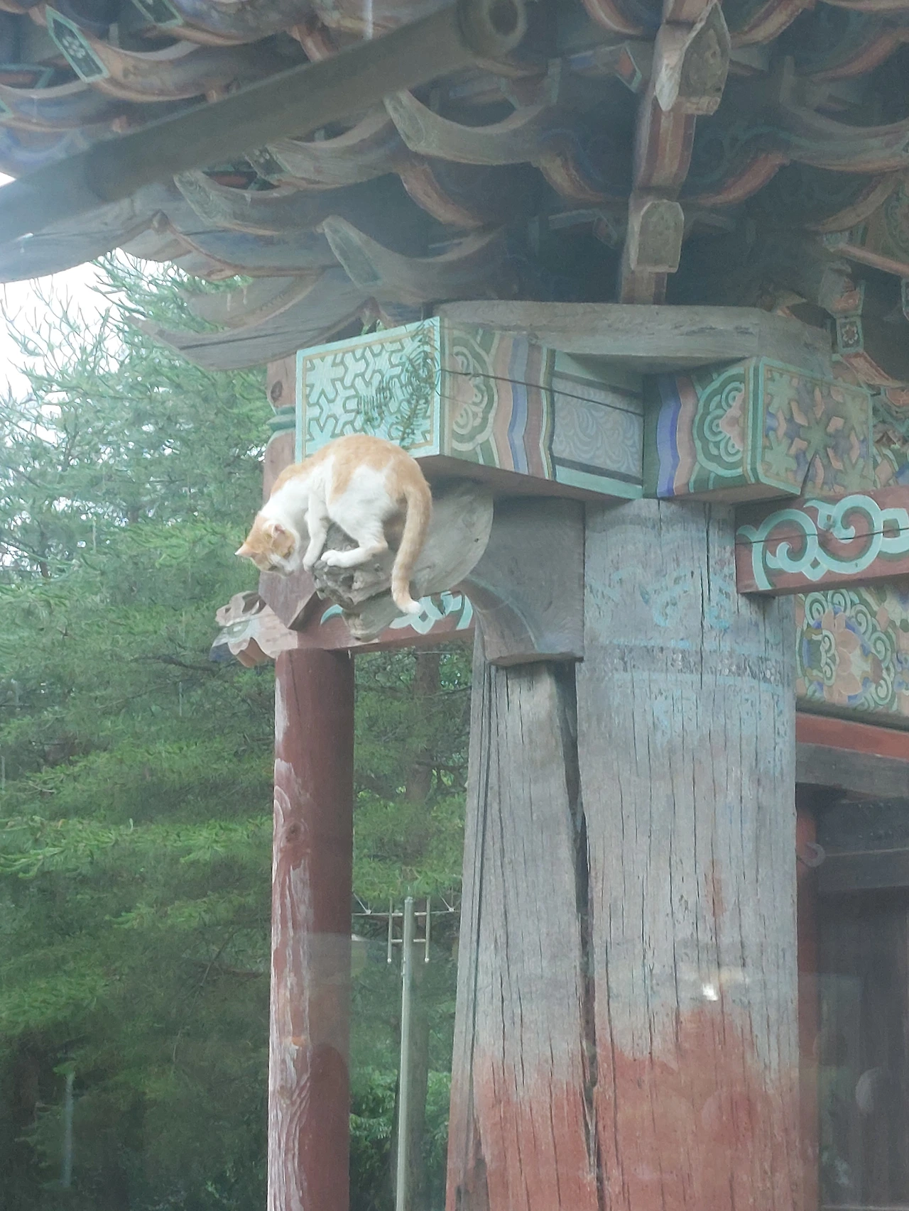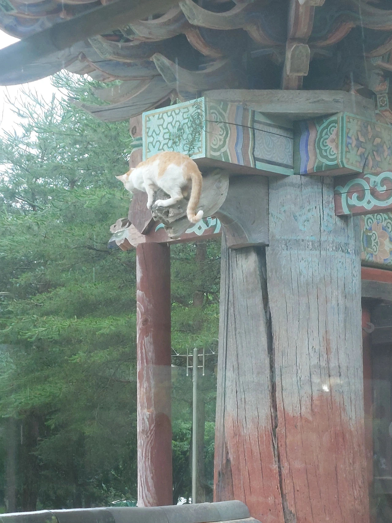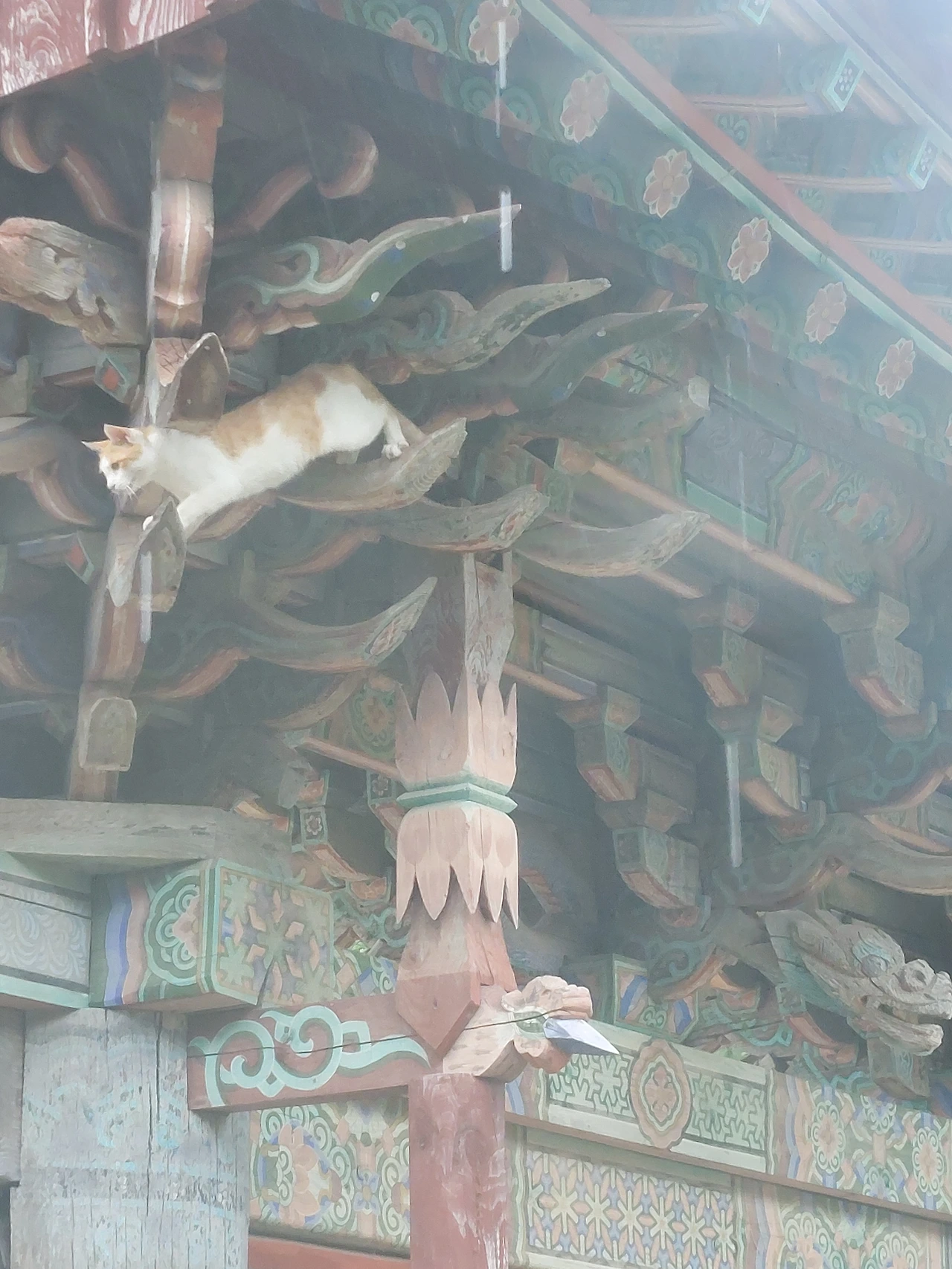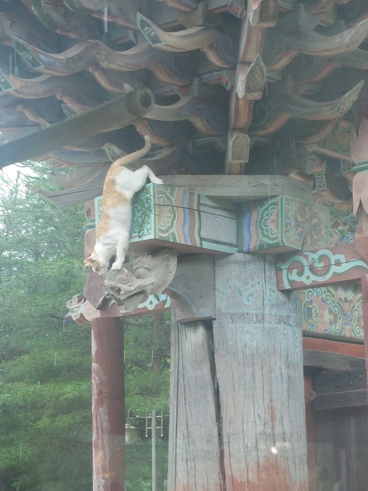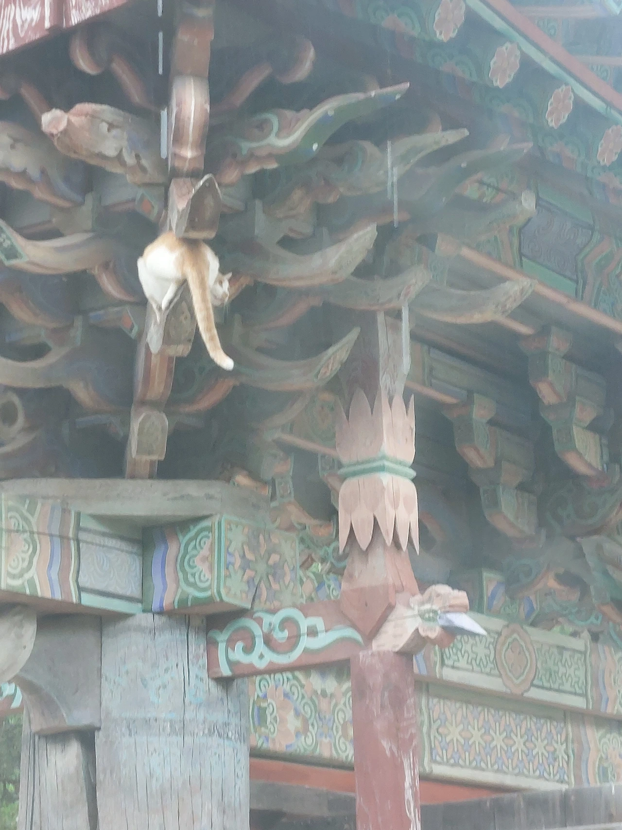 비가 속수무책으로 내리다 보니 고양이들이 보이지 않는다. 걱정이 되어 이름을 불렀더니 목소리만 가늘게 들려온다. 목소리는 들려오는데 어딘지 알 수가 없다. 좀처럼 보이지 않아서 두리번거리니 아, 글쎄 위험 천만한 곳에서 나를 애처롭게 바라본다. 오늘, 갑자기 장맛비가 쏟아져서 말랑이도 미처 비를 피할 사이가 없었나 보다. 지상에서 대략 8~9m 위에 놓인 일주문이다.