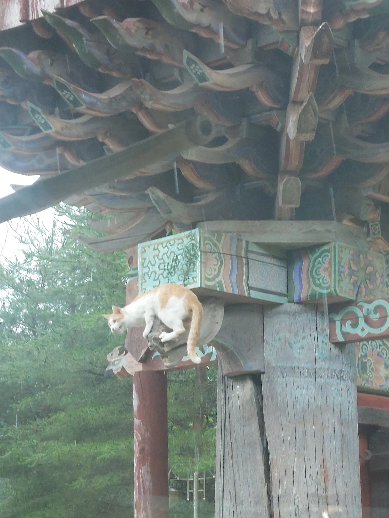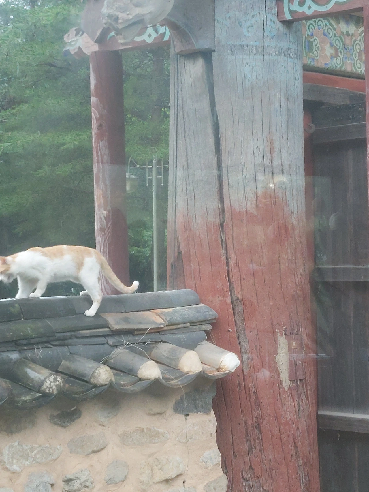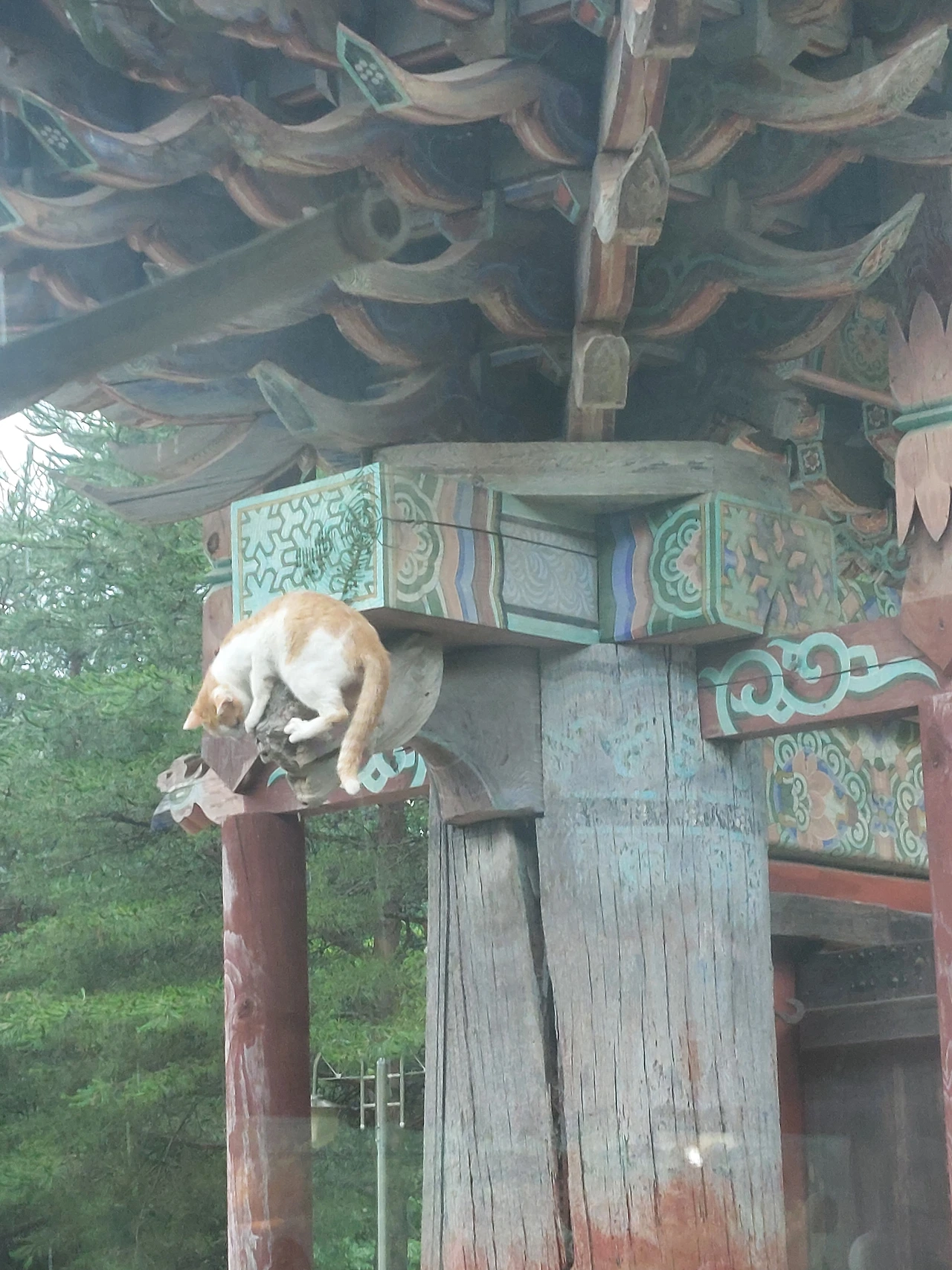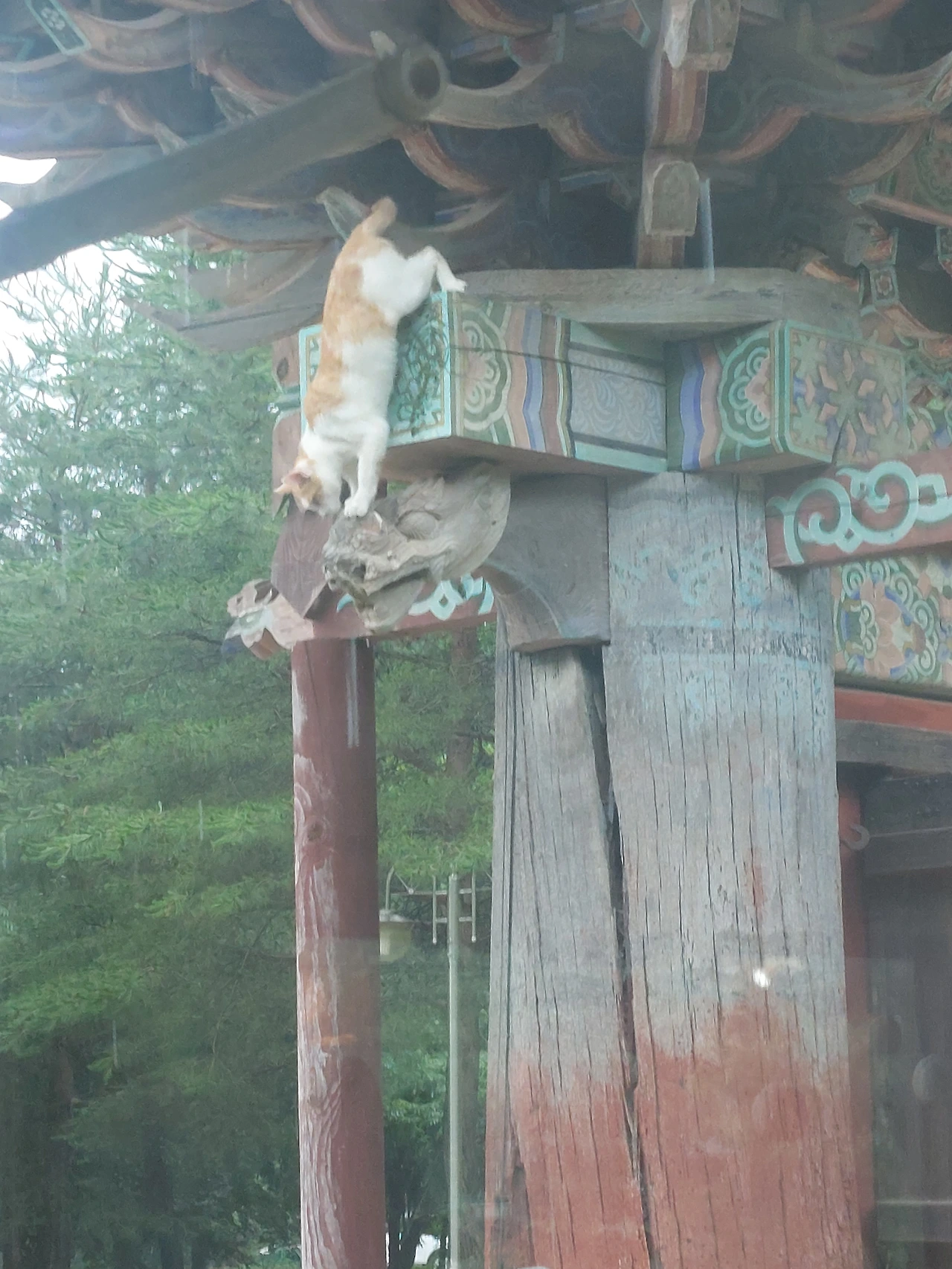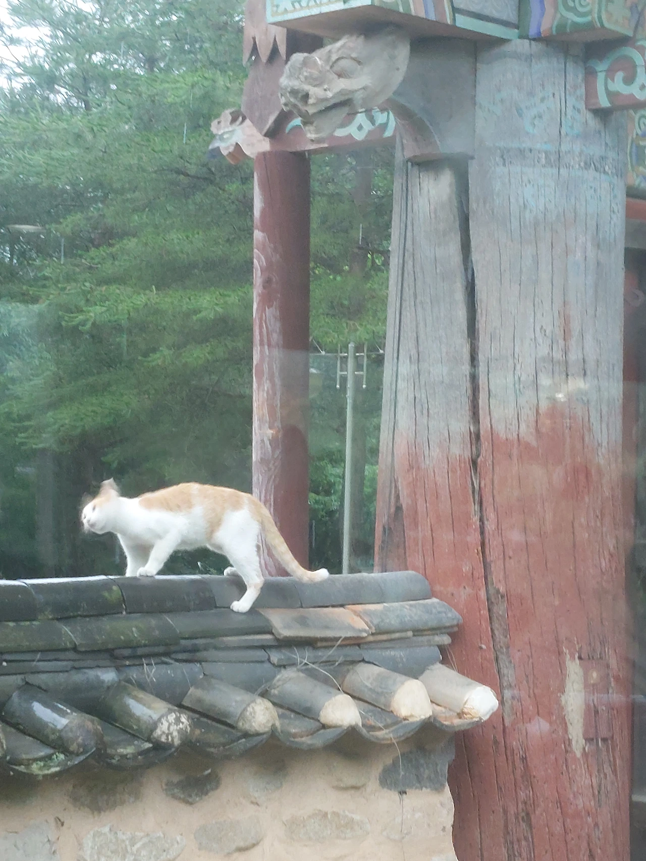 비가 속수무책으로 내리다 보니 고양이들이 보이지 않는다. 걱정이 되어 이름을 불렀더니 목소리만 가늘게 들려온다. 목소리는 들려오는데 어딘지 알 수가 없다. 좀처럼 보이지 않아서 두리번거리니 아, 글쎄 위험 천만한 곳에서 나를 애처롭게 바라본다. 오늘, 갑자기 장맛비가 쏟아져서 말랑이도 미처 비를 피할 사이가 없었나 보다. 지상에서 대략 8~9m 위에 놓인 일주문이다.