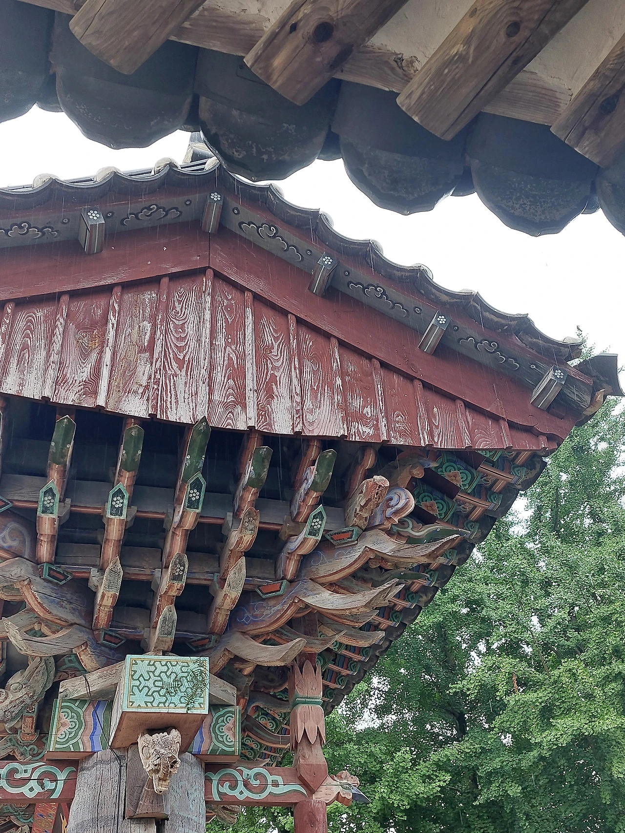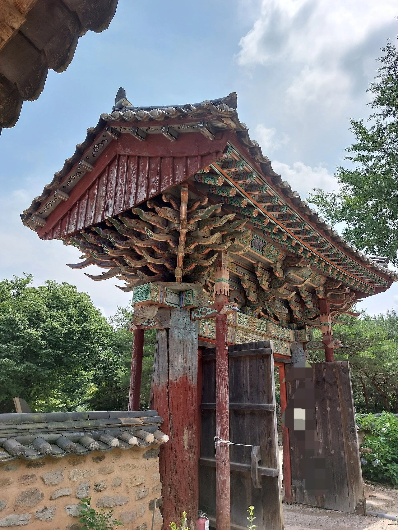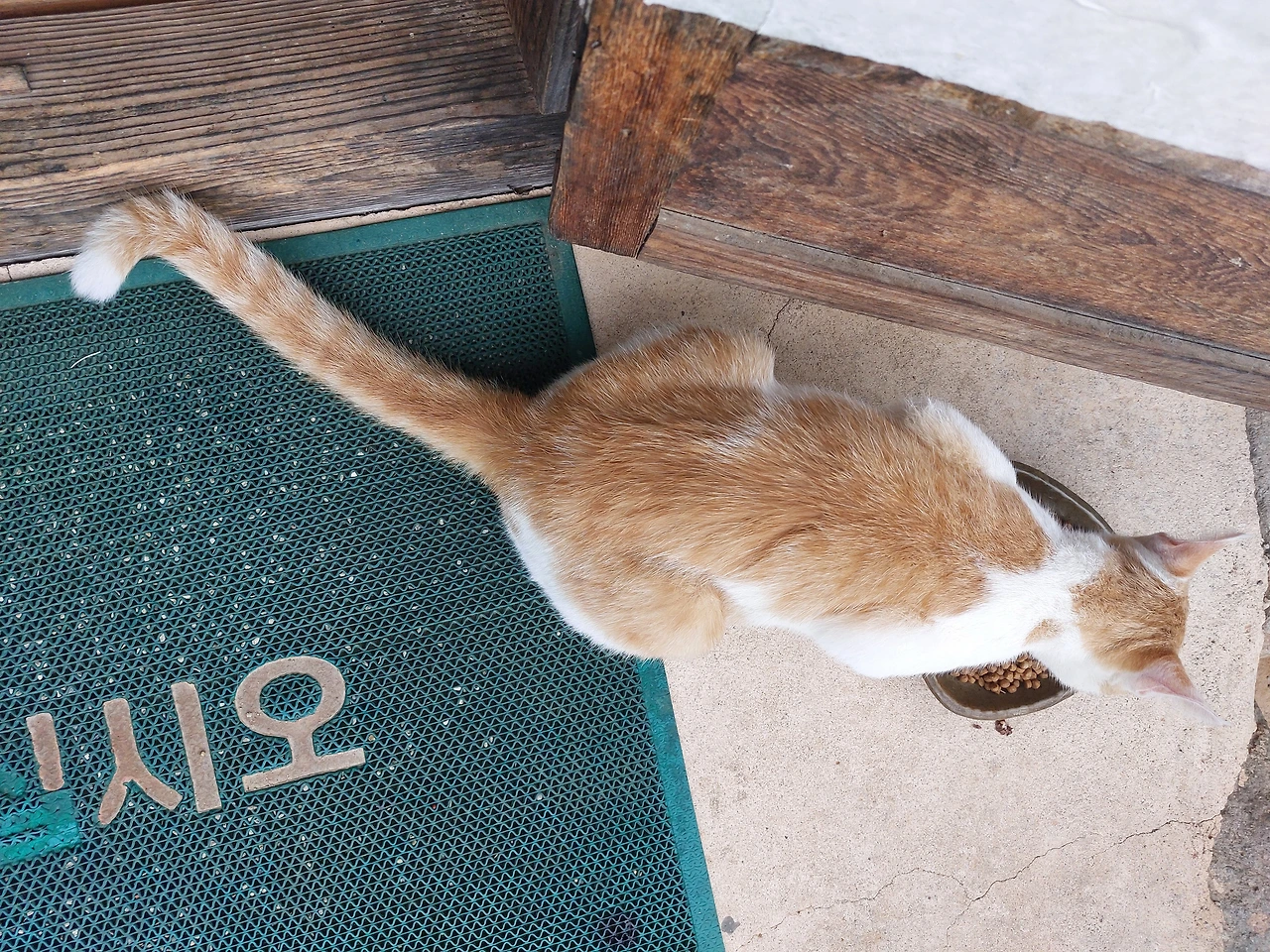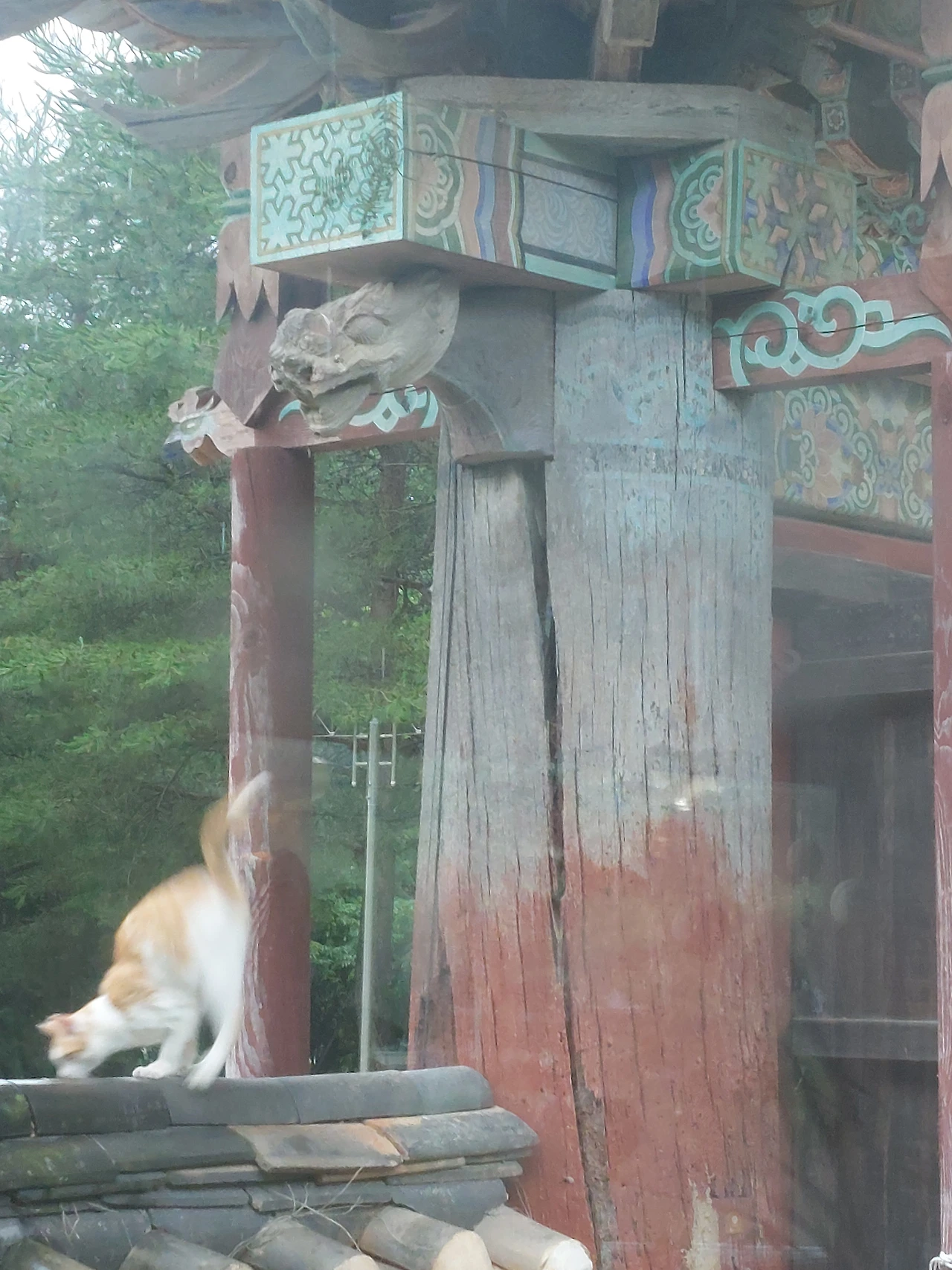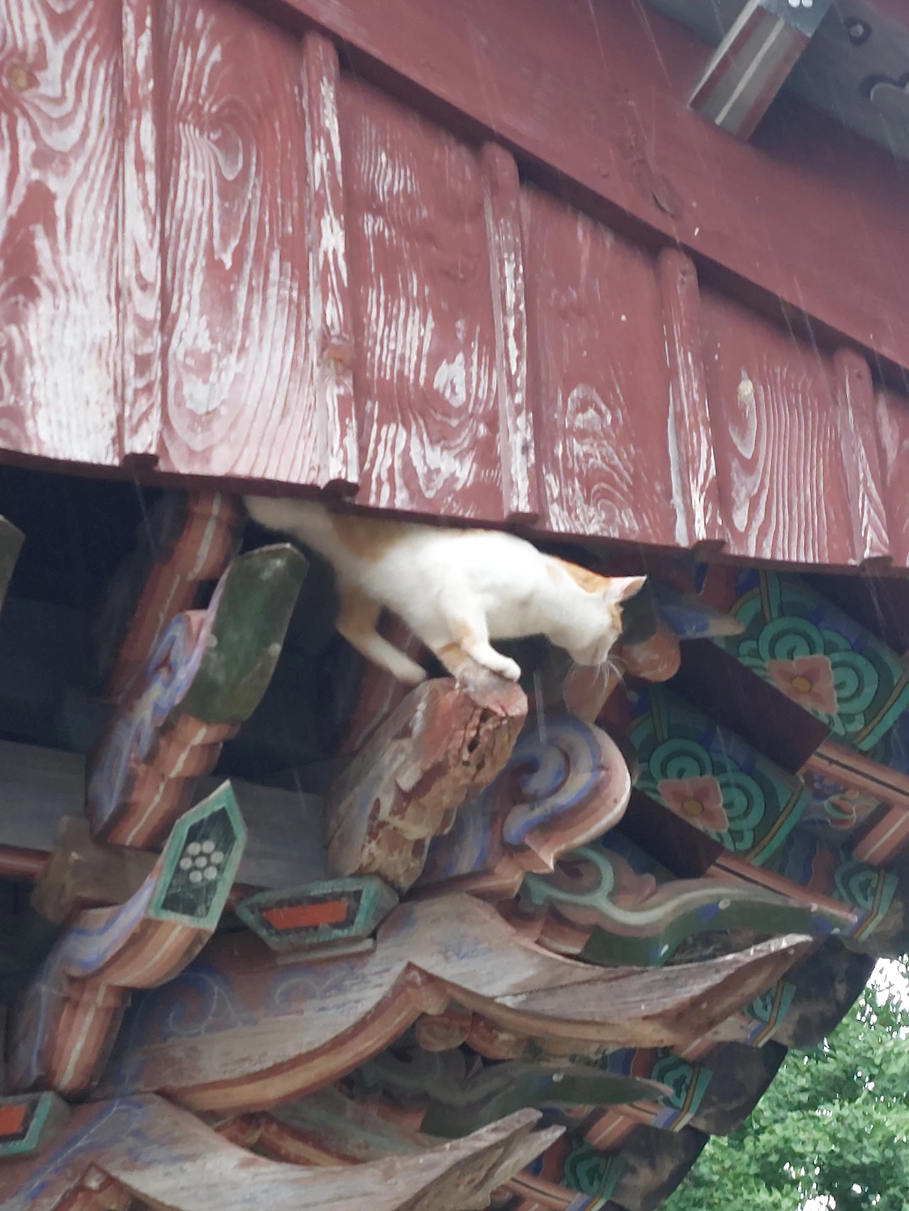 비가 속수무책으로 내리다 보니 고양이들이 보이지 않는다. 걱정이 되어 이름을 불렀더니 목소리만 가늘게 들려온다. 목소리는 들려오는데 어딘지 알 수가 없다. 좀처럼 보이지 않아서 두리번거리니 아, 글쎄 위험 천만한 곳에서 나를 애처롭게 바라본다. 오늘, 갑자기 장맛비가 쏟아져서 말랑이도 미처 비를 피할 사이가 없었나 보다. 지상에서 대략 8~9m 위에 놓인 일주문이다.
